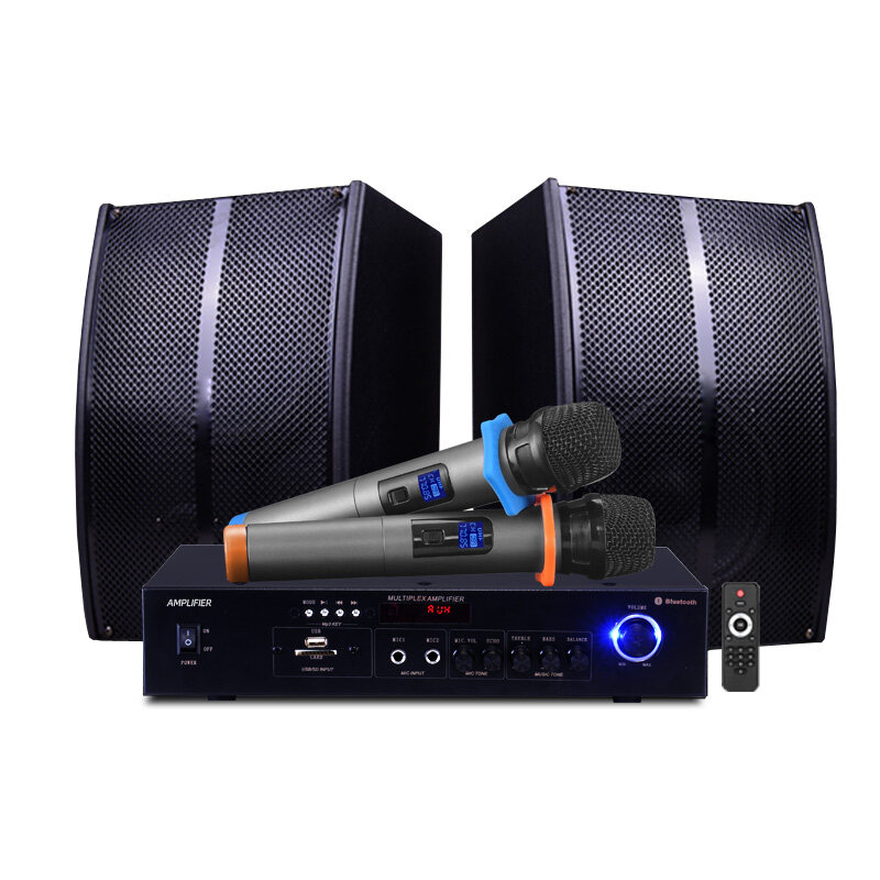 Speaker is wooden material. 2-Channel power amplifier (Upgraded version 50W+50W).Amplifier built-in Bluetooth for easy entertainment. Free 2 wireless microphones. Amplifier can only be used with 220V~240V 50Hz/60Hz AC power supply.Suitable for 40㎡-80㎡ of space use.Each speaker uses a 8 inch woofer and 3.5 inch tweeter.Supports microphone input, Bluetooth, and USB input.Can be connected to Bluetooth, mobile phones, TV, TV BOX, PC, etc. to play sounds.In the package: Amplifier x1, Speaker x2, Wireless MIC x2, Remote Control x1, Speaker Line x2, Audio Cable x1
