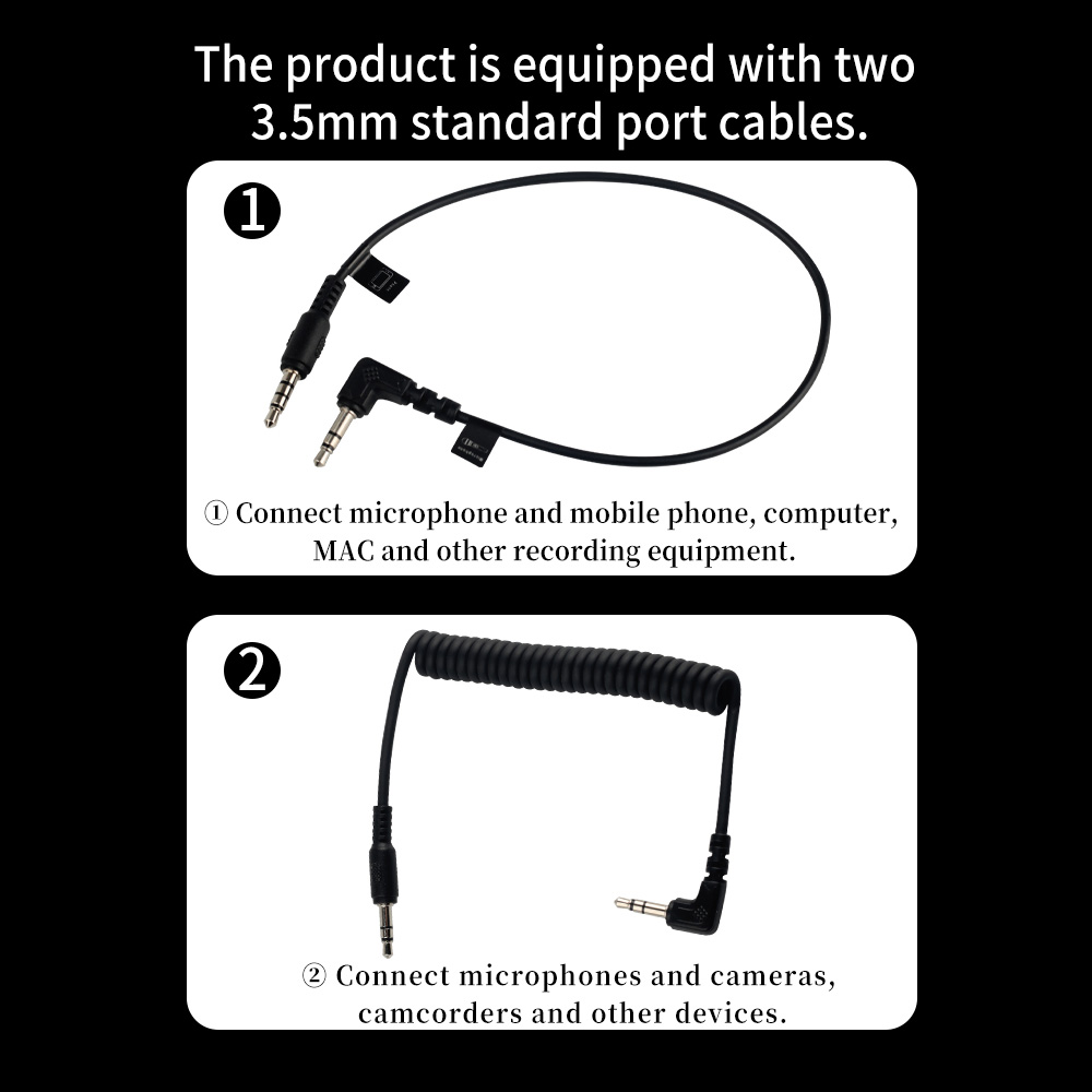 Also comes with 3.5mm TRS output cable (for DSLR Cameras, Camcorders, Audio Recorders) and 3.5mm TRRS output cable (for Smartphones, Tablets, and).