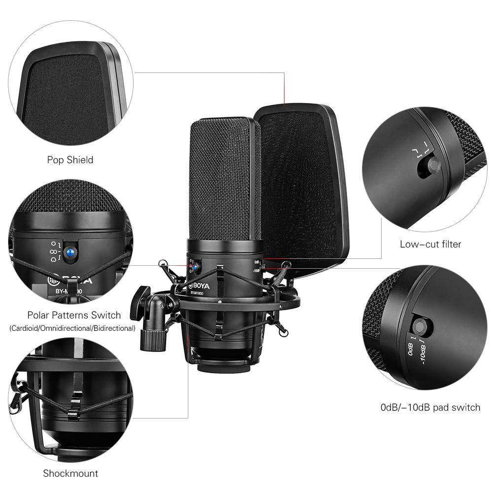 Features: The BOYA BY-M1000 is a 34mm/1.3in diaphragm condenser microphone, with sturdy all-metal housing, it can be mounted on 5/8in arm stand. Included shockmount & pop filter. With 3 selectable polar patterns switch, support Cardioid/Omnidirectional/Bidirectional, easy to deal with all kinds of recording occasions. Low-cut filter switch at 150Hz allows you to eliminate low frequency hum and other low frequency noises; And 0dB/-10dB pad switch is to reduce the pickup sensitivity and output impedance of the condenser microphone. The microphone offers a 20Hz to 20kHz frequency response for accurately reproducing audio signal in a variety of ranges. Uses standard 24V or 48V phantom power, which is supplier through the standard XLR connector. Suitable for capturing instruments and vocals in project and professional recording applications, such as singer, songwriters, podcasters, voiceover artists, field recorders, and home studio recordings.Specifications: Color: Black Material: Aluminum Alloy Acoustic Principle: Condenser Polar Pattern: Cardioid, Omnidirectional, Bidirectional Diaphragm: 34mm(1.3inch) Frequency Response: 20-20,000Hz Sensitivity: -33±3dB(0dB=1V/Pa at 1KHz) SN: 80dB and more Output Impedance: 20 Ohm Power Requirement: 24V or 48V Phantom Cable Length: (10ft) Item Size: 11.5 * 16.5 * 20.0cm / 4.5 * 6.5 * 7.9in Item Weight: 664g / 23.4oz Package Size: 24.3 * 20.3 * 15.4cm / 9.6 * 8.0 * 6.1in Package Weight: 1083g / 38.2ozNote: The arm stand is not included.