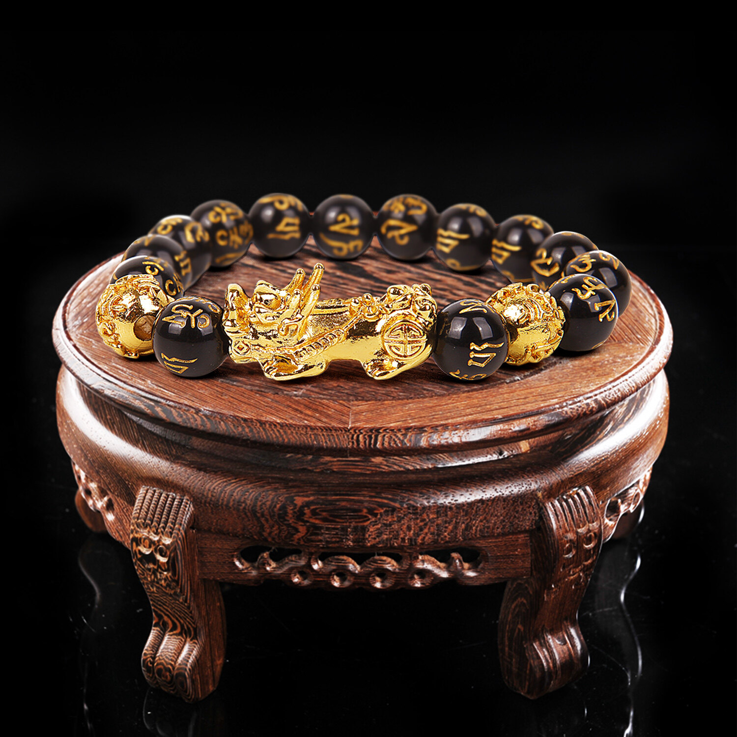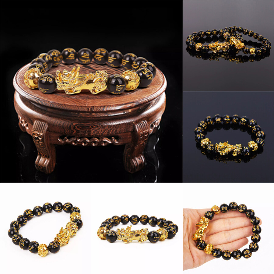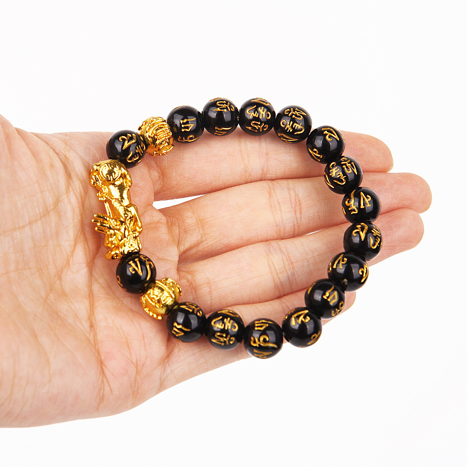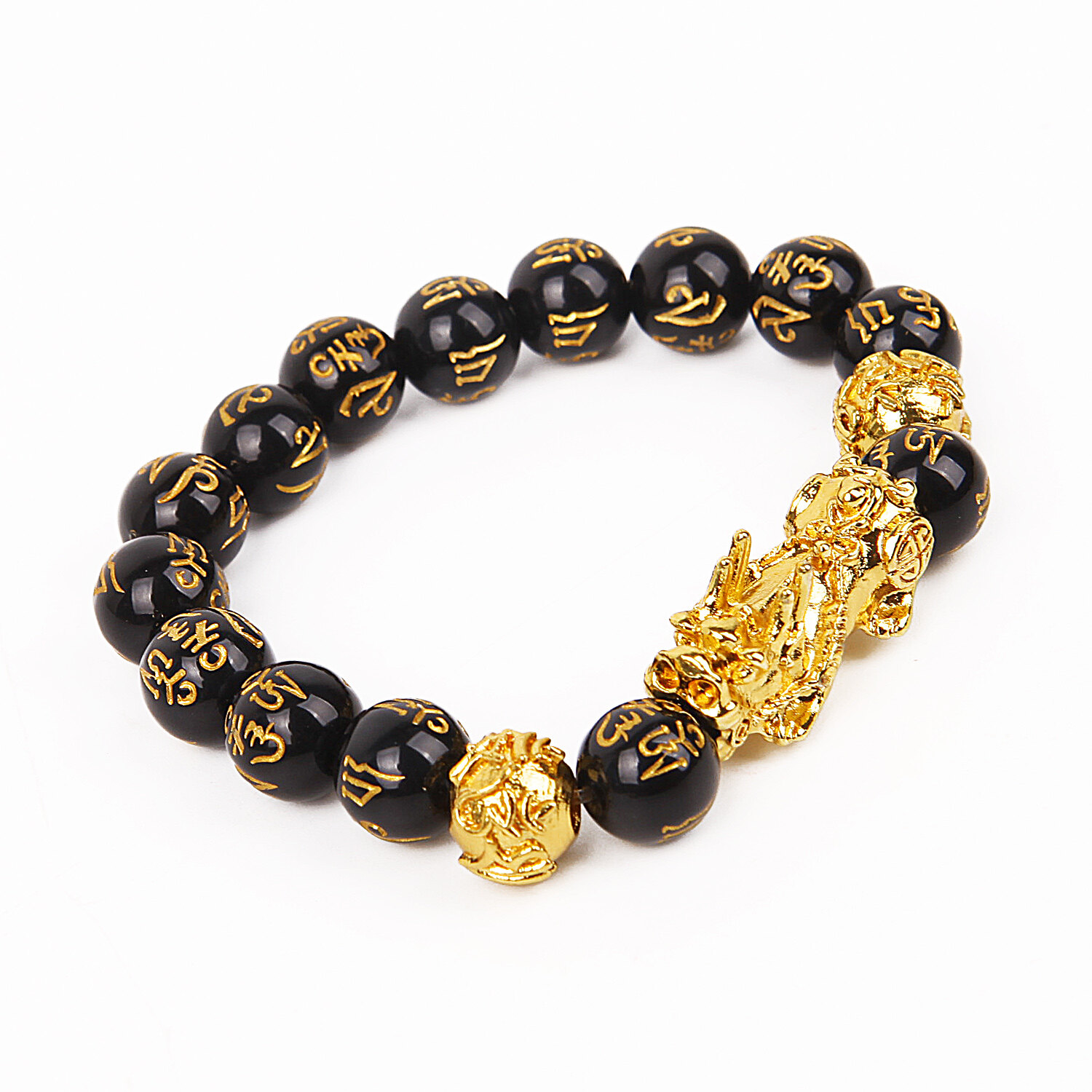 【PrettySet】 Lucky Gold PiXiu Bead Bracelet Feng Shui Prosperity Hand Carved Bead Jewelry Black Attract Wealth Bracelet S15