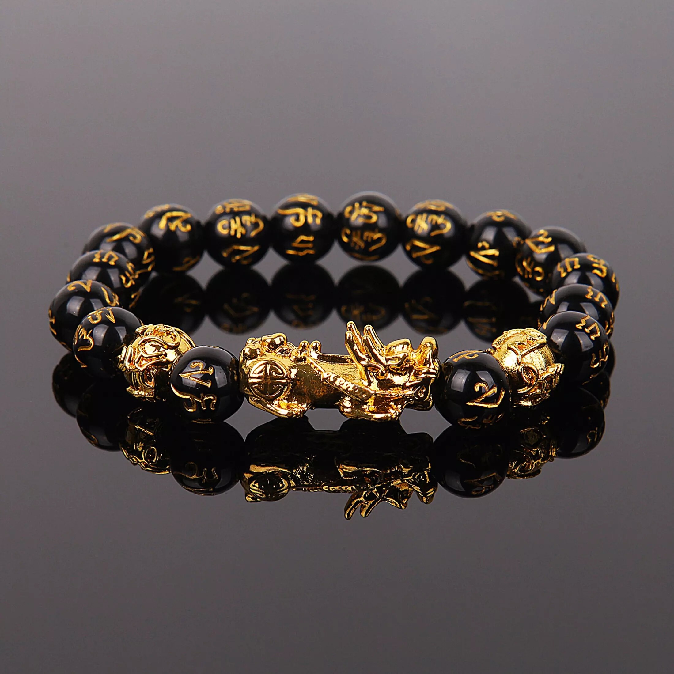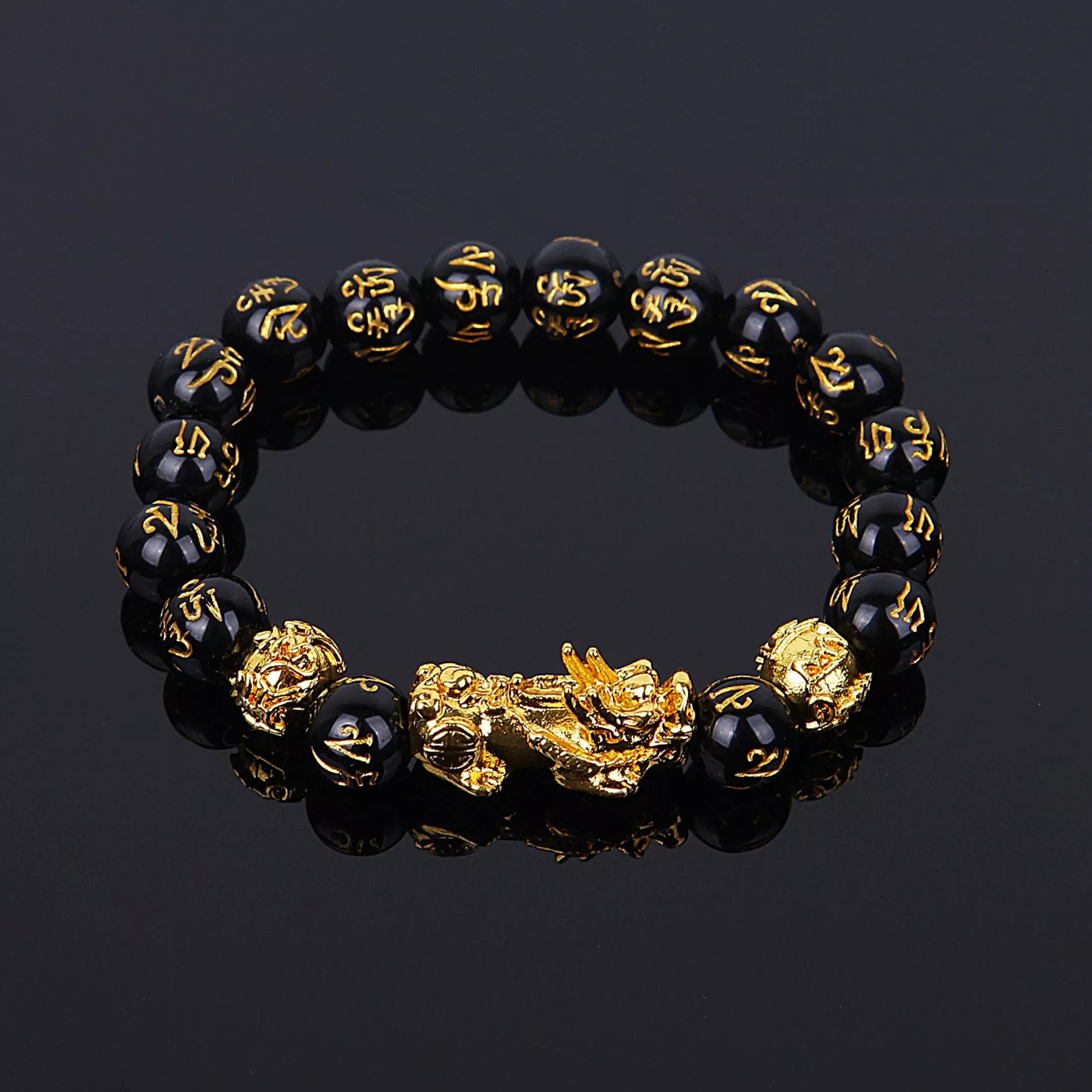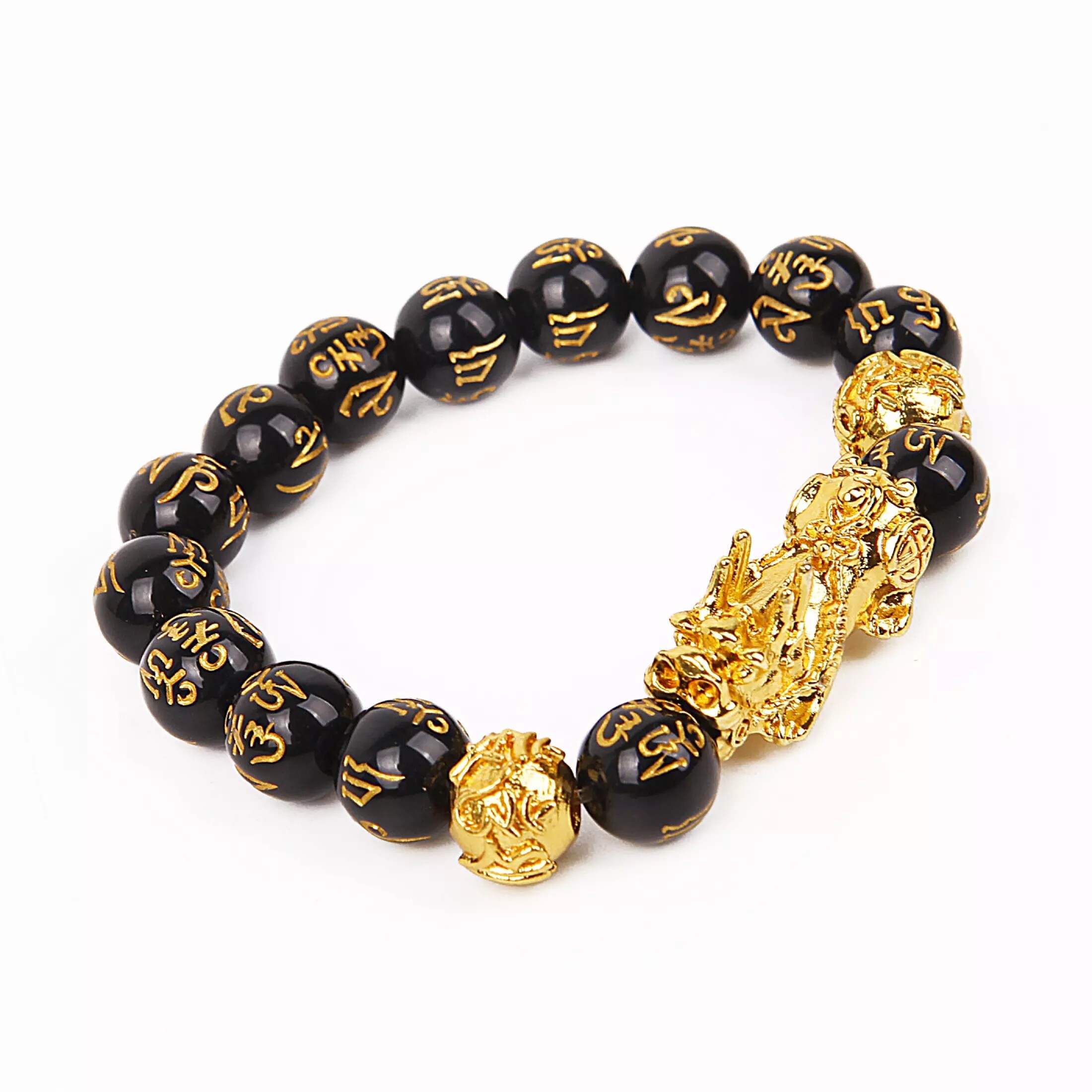 【PrettySet】 Lucky Gold PiXiu Bead Bracelet Feng Shui Prosperity Hand Carved Bead Jewelry Black Attract Wealth Bracelet S15