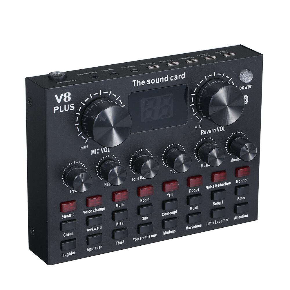 The live sound card contains 16 live effects, 12 electronic music effects, 4 sound field effects, 3 voice change. Digital display, one-key dodge, volume adjustable. It supports two phones live and one phone BT accompaniment meanwhile.