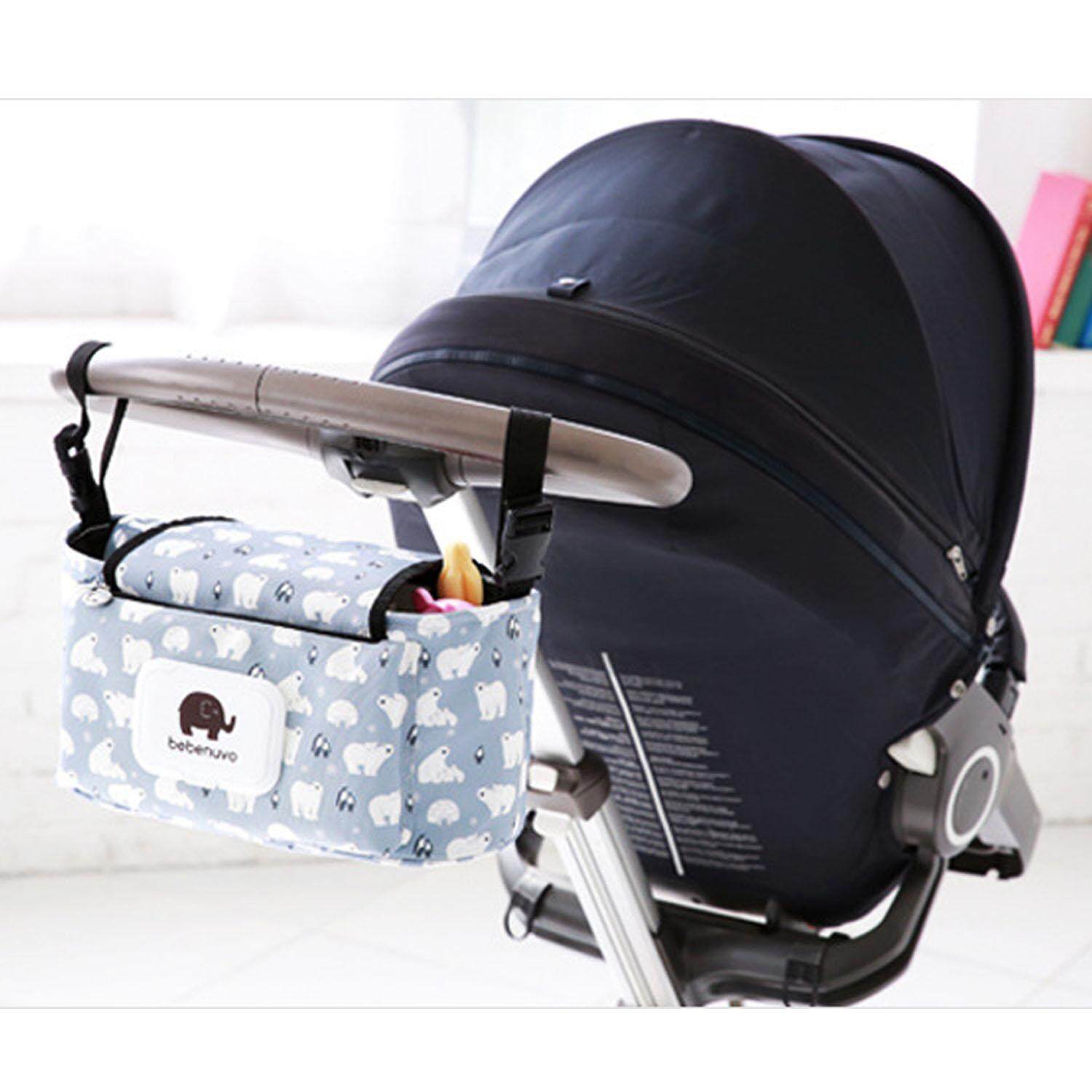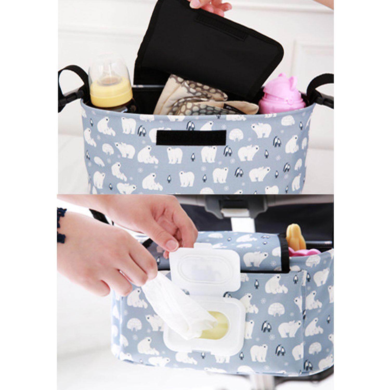 A multi functional, large capacity baby carriage pouch with several separate pouches inside, can contain various baby items, such as a milk bottle, water bottle, diapers, towel, facial tissues, toys, necessary clothes, etc.