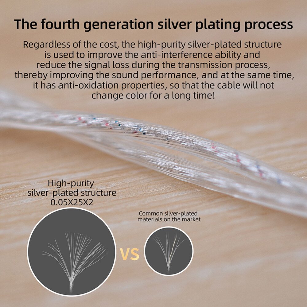 Regardless of the cost, the high-purity silver-plated structure is used to improve the anti-interference ability and reduce the signal loss during the transmission process, thereby improving the sound performance, and at the same time, it has anti-oxidation properties, So that the cable will not change color for a long time!