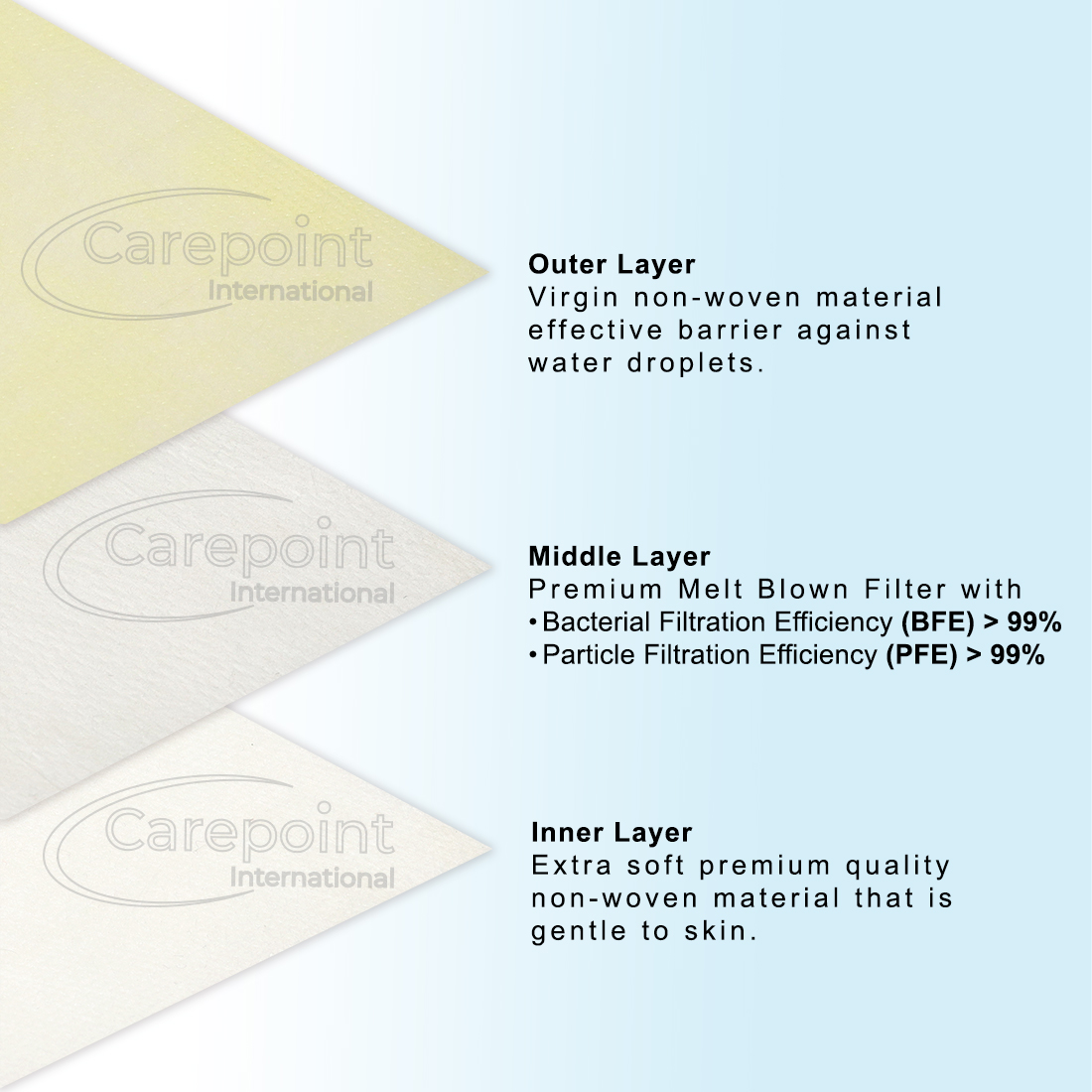 3ply Disposable surgical face mask with non-fiber-glass filter medium (Melt Blown), integrated nose bridge, soft non irritating elastic bands (Earloop).