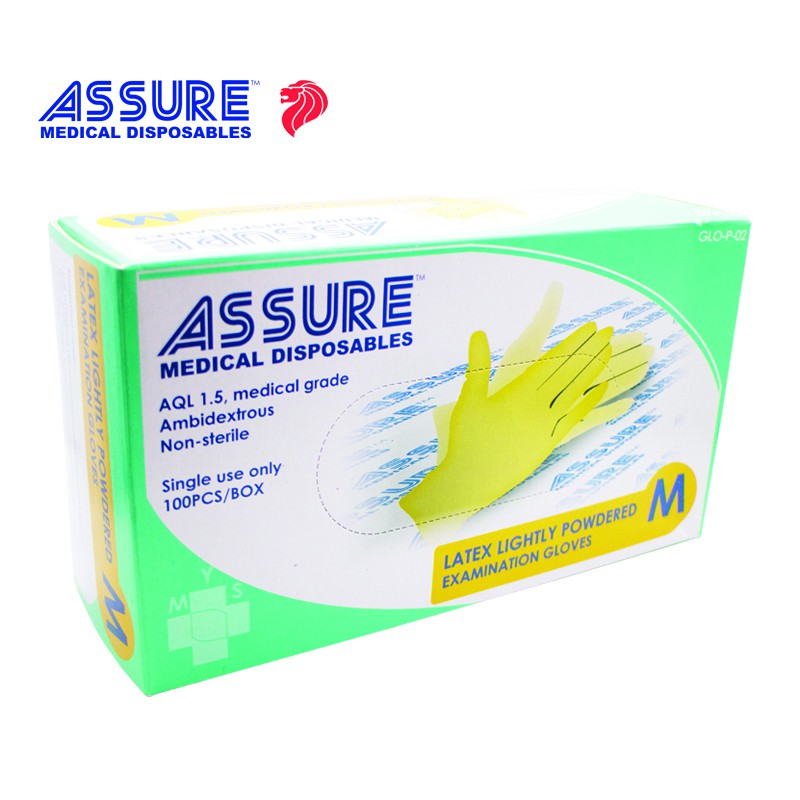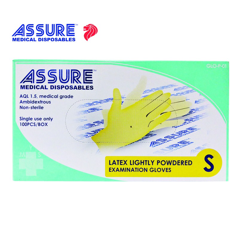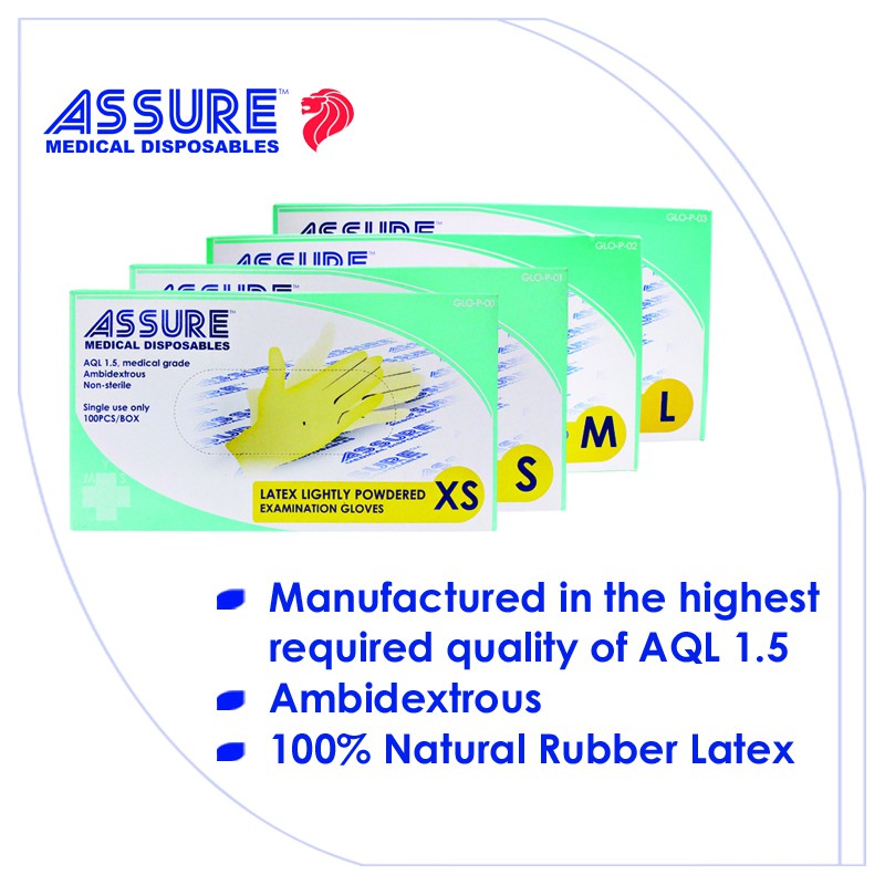 ASSURE Disposable Examination Latex Gloves Lightly Powdered (100pcs/box, Size: XS/S/M/L)