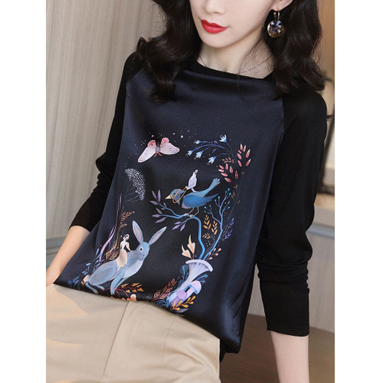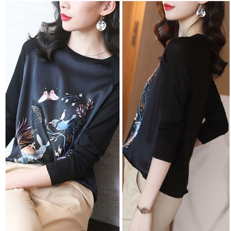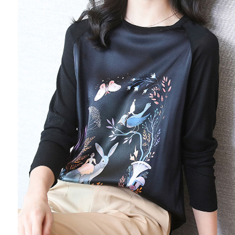 AMMIN Silk Long Sleeve Top For Women O-Neck Black Printed Mulberry Silk Loose T-shirt Blouse