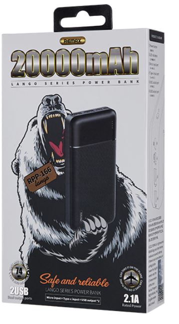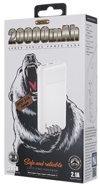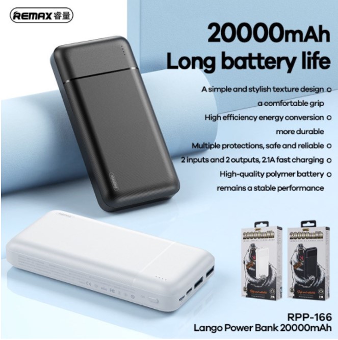 Capacity: 20,000Mah Dimension:14 X 7 X 2.5 cmCurrent: 2.1A Fast chargingModel: RPP-166Battery Indicator: 4 LED lightsInput: Micro USB, Type COutput: USB X 2Colours: Black, WhiteWeight: ~380gram per power bank