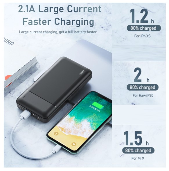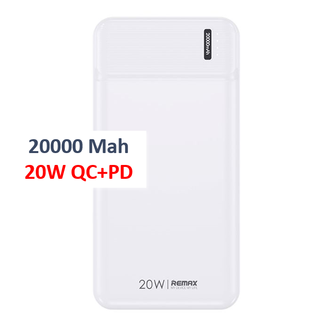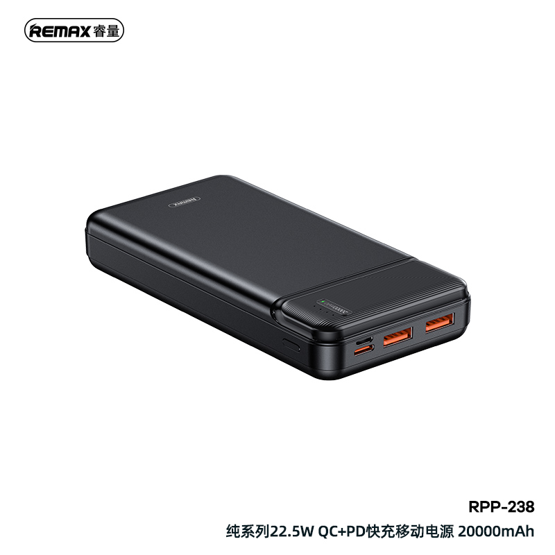 Remax 20,000mAh PD QC 22.5WCapacity: 20,000MahDimension:13 X 7 X 2.5 cmCurrent: up to 4.5A Fast chargingModel: RP-238Battery Indicator: 4 LED lightsInput: Micro USB, Type COutput: USB X 2, Type CColours: Black, WhiteWeight: ~460gram per power bank