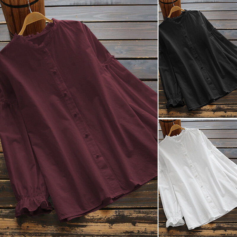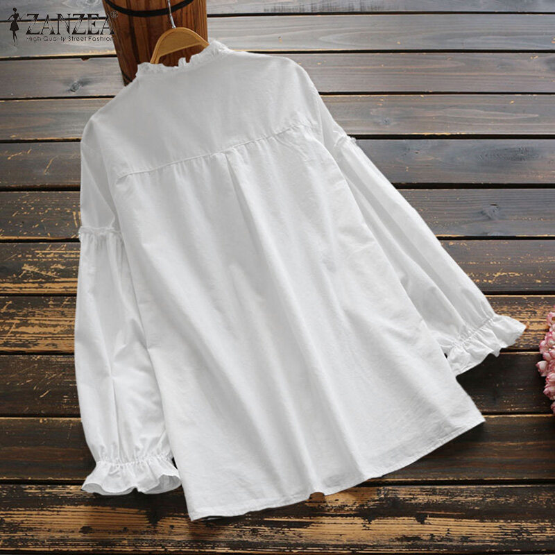 Muangee Women Linen Cotton Vintage Tops Shirt Ruffles Sleeve Blouse Tee Pullover ZANZEA