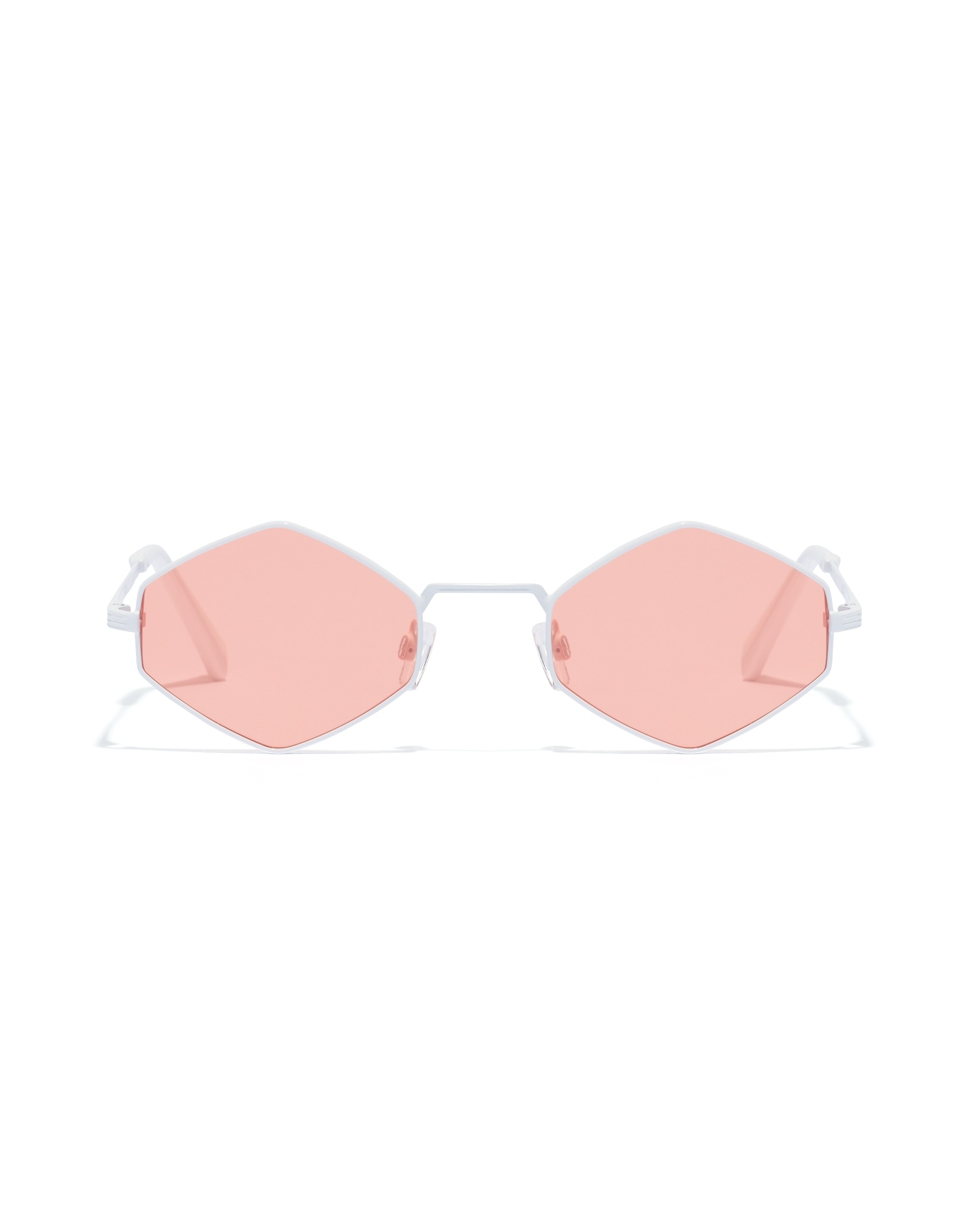 This model is a reinterpretation of the hexagonal frame trend of the 90s. Combining a thin metallic structure in polished white with cosmetic orange lenses and white TR90 nyon earpieces.