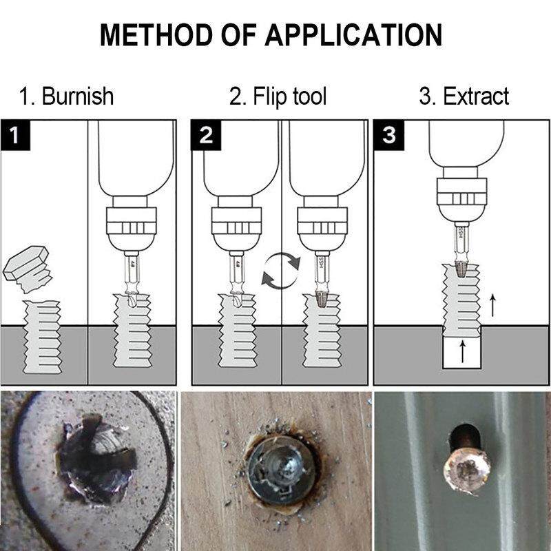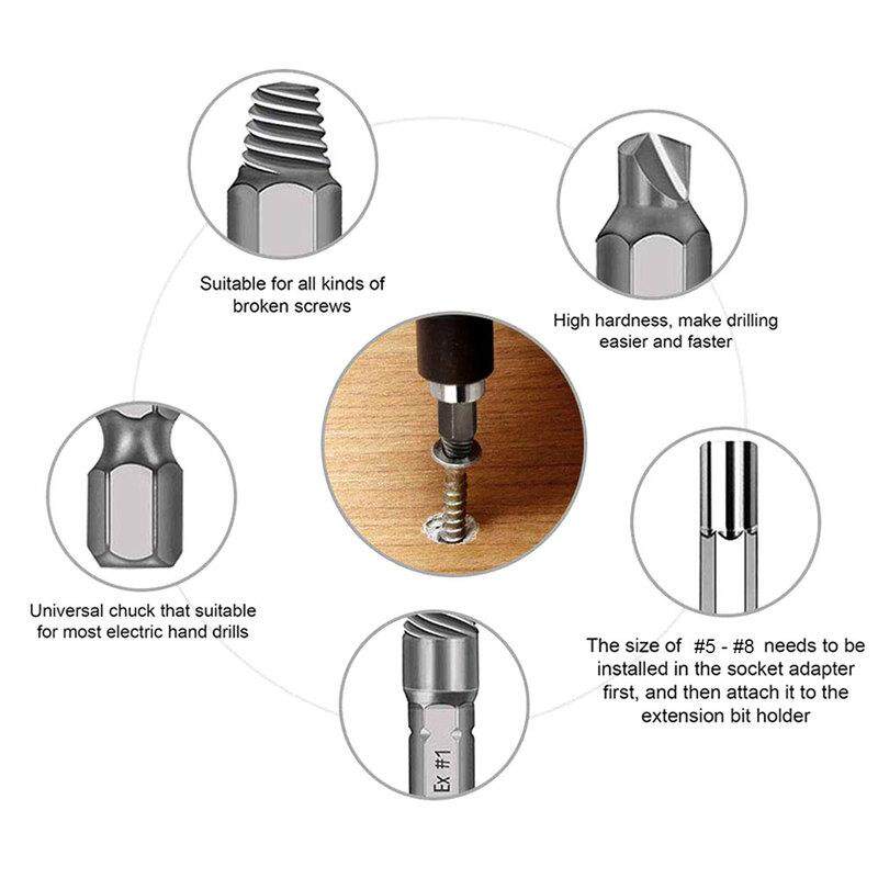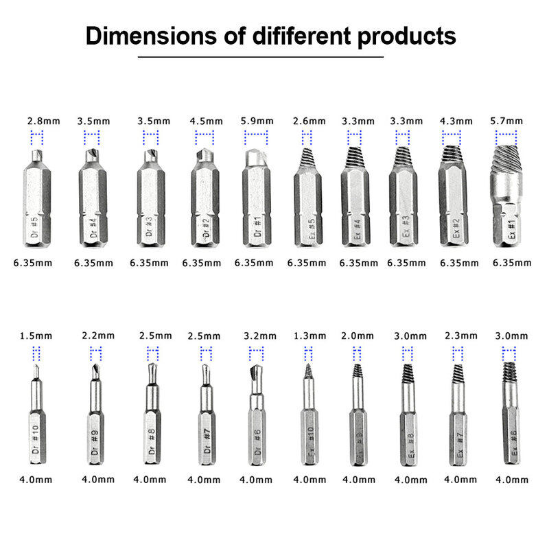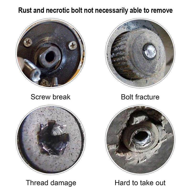• The extractor set made by HSS material can create more extraction possibilities for broken screws or bolts of different sizes (2-12mm) and can work on irregular and jagged irregular cuts.