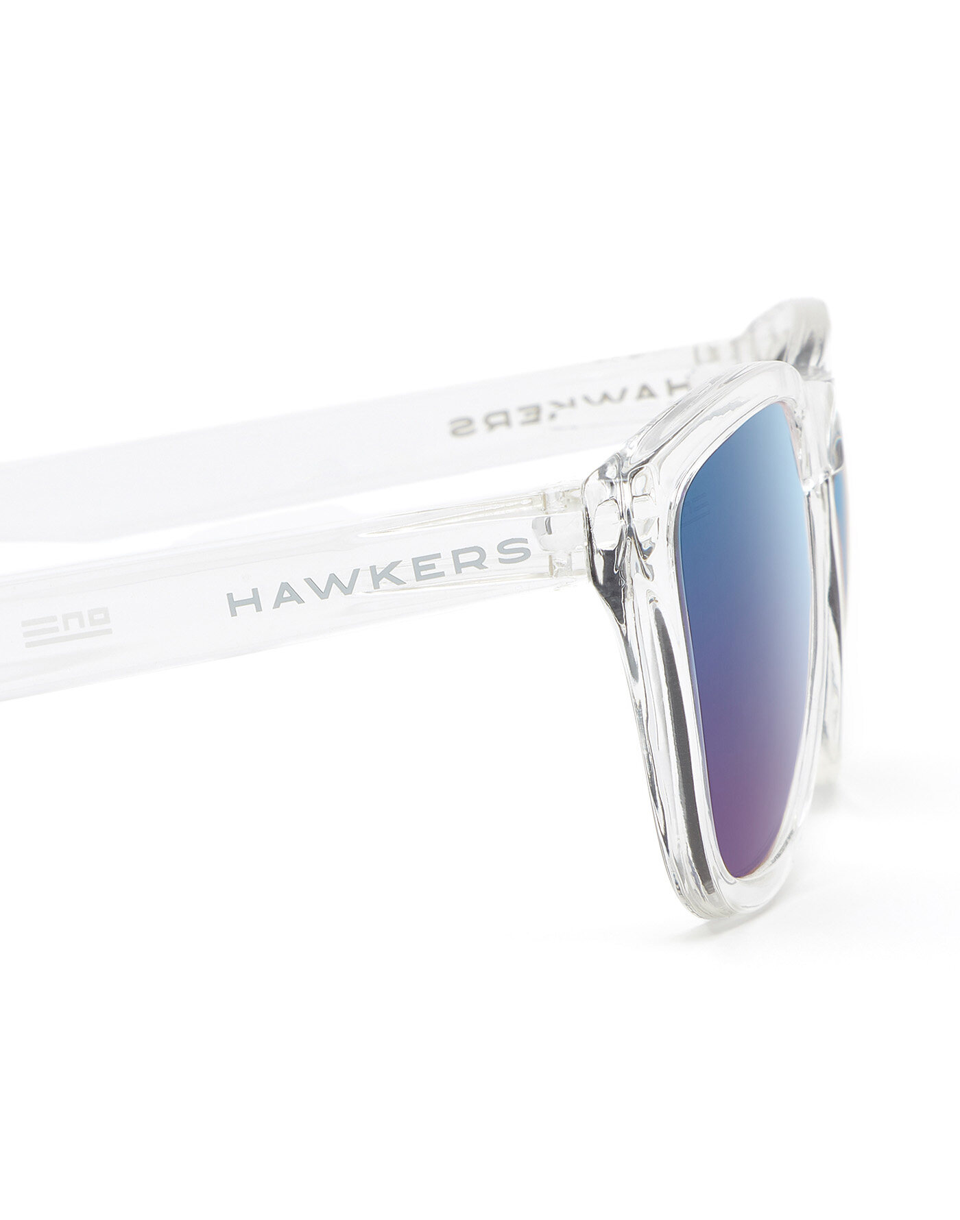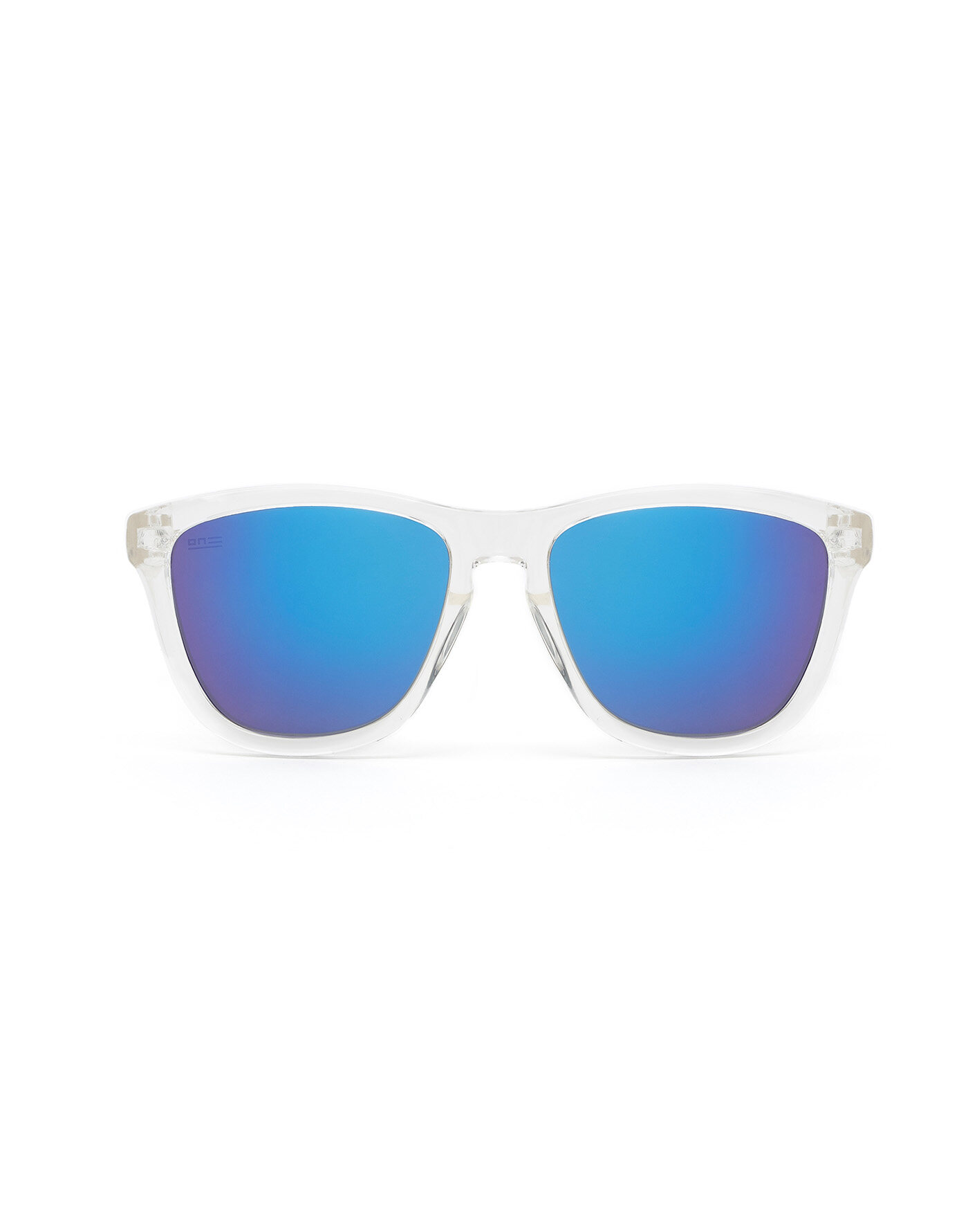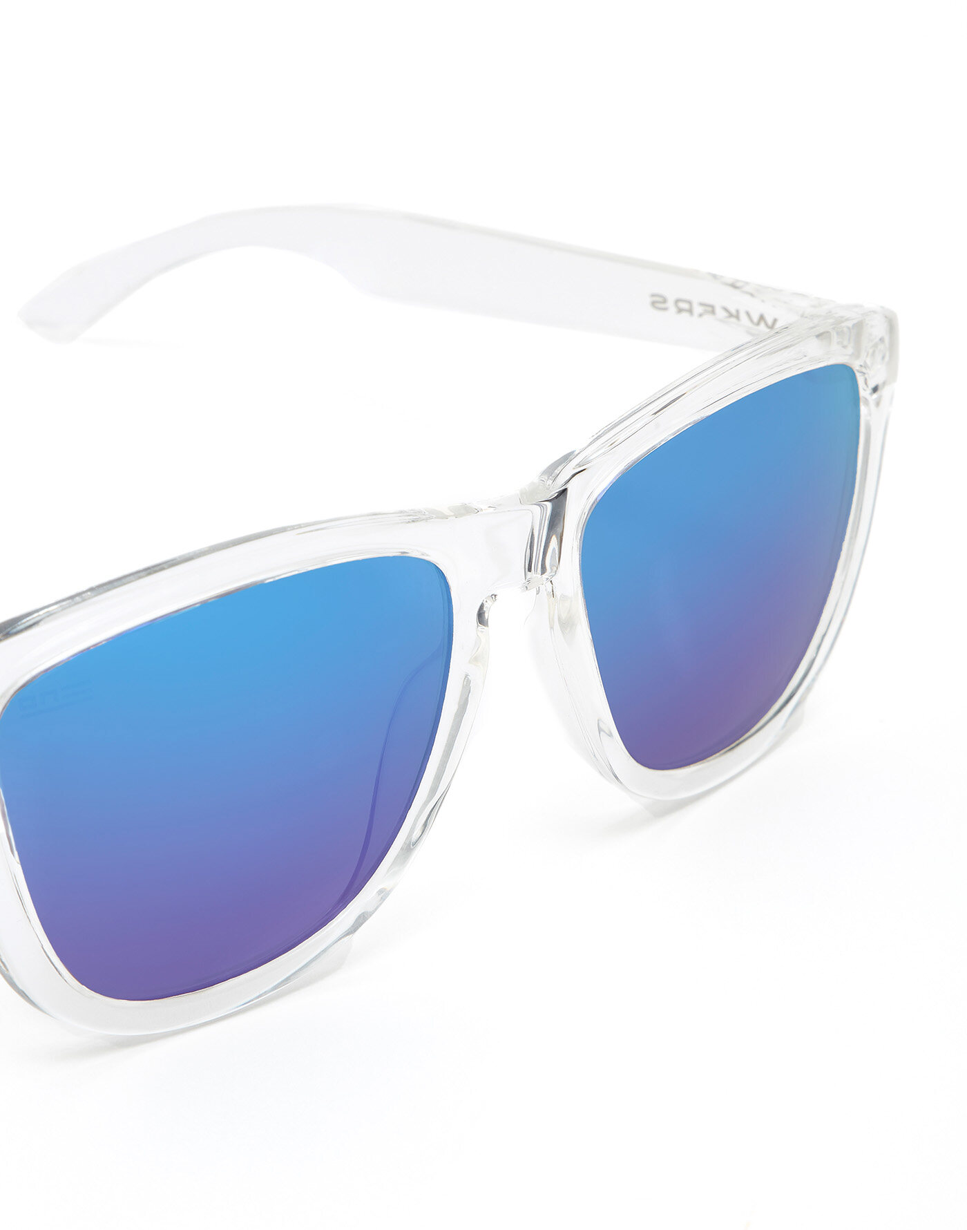 Clear frame with cobalt blue mirror lenses.
