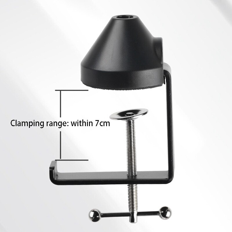 A specially designed table mounting clamp for universal microphone suspension boom scissor arm stand. Heavy-duty metal clip base provides a sturdy and reliable way to hold your microphone stand. Soft foam padding protection at the contact point with table considerately protects your desktop surface from any scratches. Adjustable Table Mounting Clamp is designed to securely mount your microphone stand to table top or other flat surface using an adjustable positioning screw.