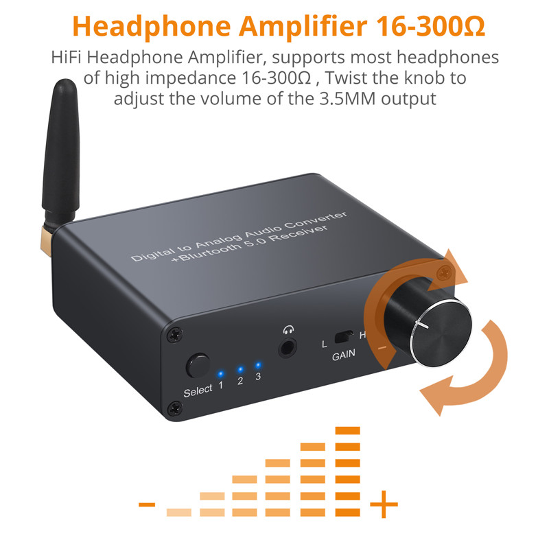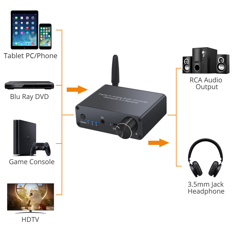 Introduction:This digital to analog audio converter is specially designed for either home or professional audio signal switching. It converts coaxial, Toslink digital audio or Bluetooth signals to analog L/R and 3.5mm jack audio signal.