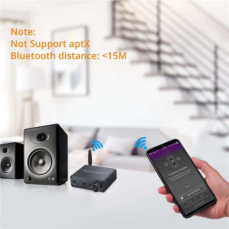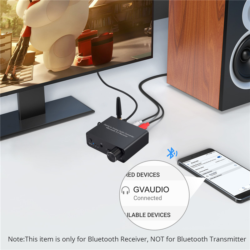 Features:1. Built-in Bluetooth V5.0 receiver module and supports mobile device Bluetooth connection.2. Supports digital audio conversion to analog audio signals.3. Built-in high-performance DAC chip, supports 192K/24bit sampling rate.4. Adopts Bluetooth dedicated antenna for stable signal transmission.5. Supports one optical and one coaxial input interface.6. Supports one RCA and one 3.5mm audio output interface.7. Supports output volume adjustment.8. Ultra low power consumption.