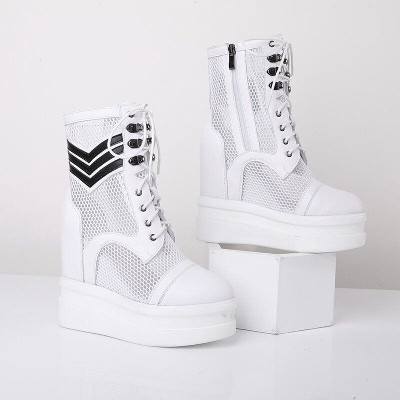 Genuine Leather Breathable Mesh Elevator 12cm Women's Shoes Sports High Heel Platform Muffin Shoes 2022 Spring and Summer Slimming