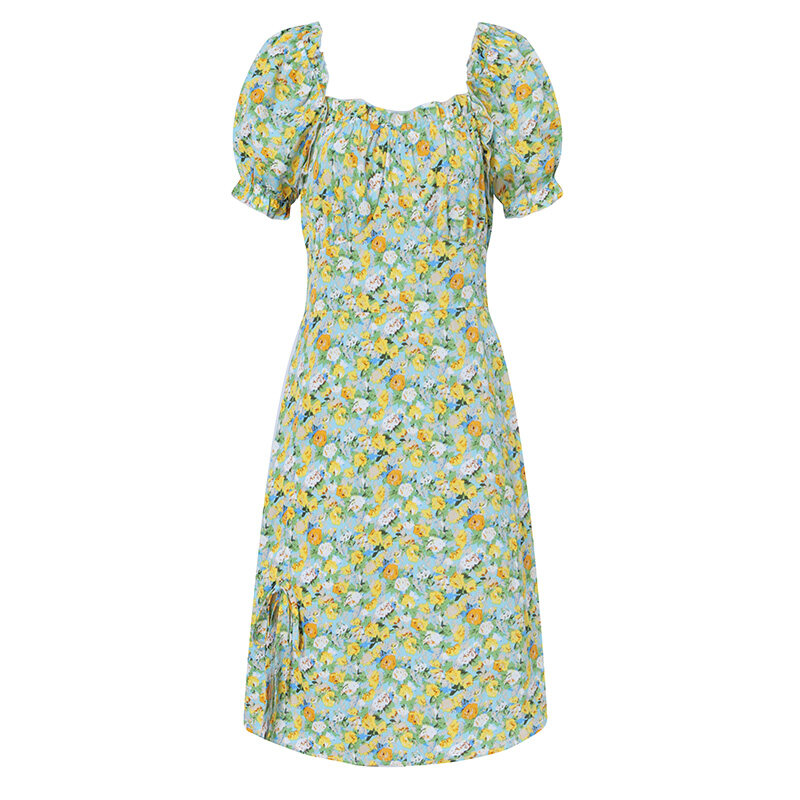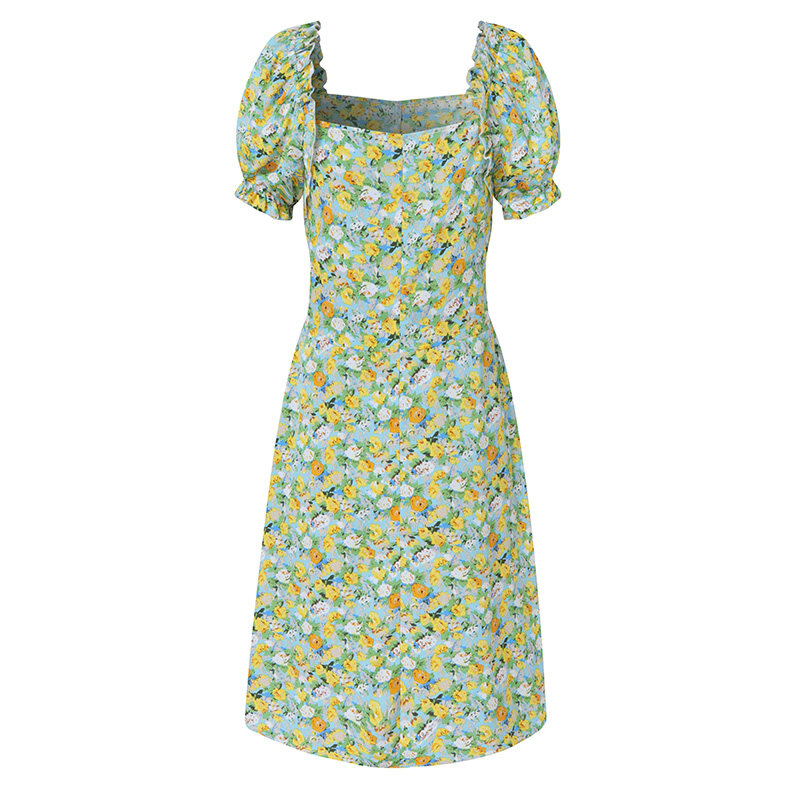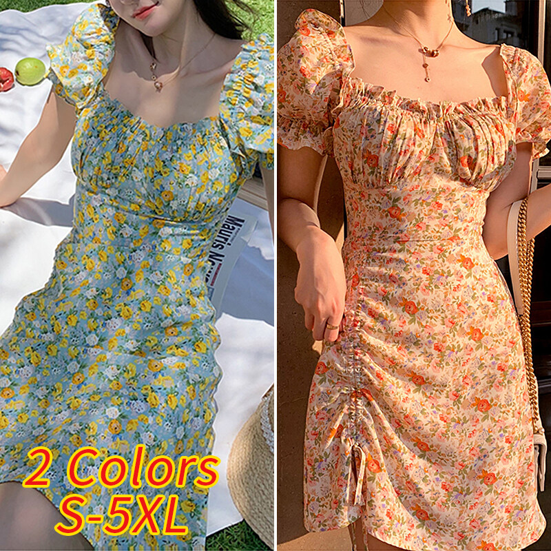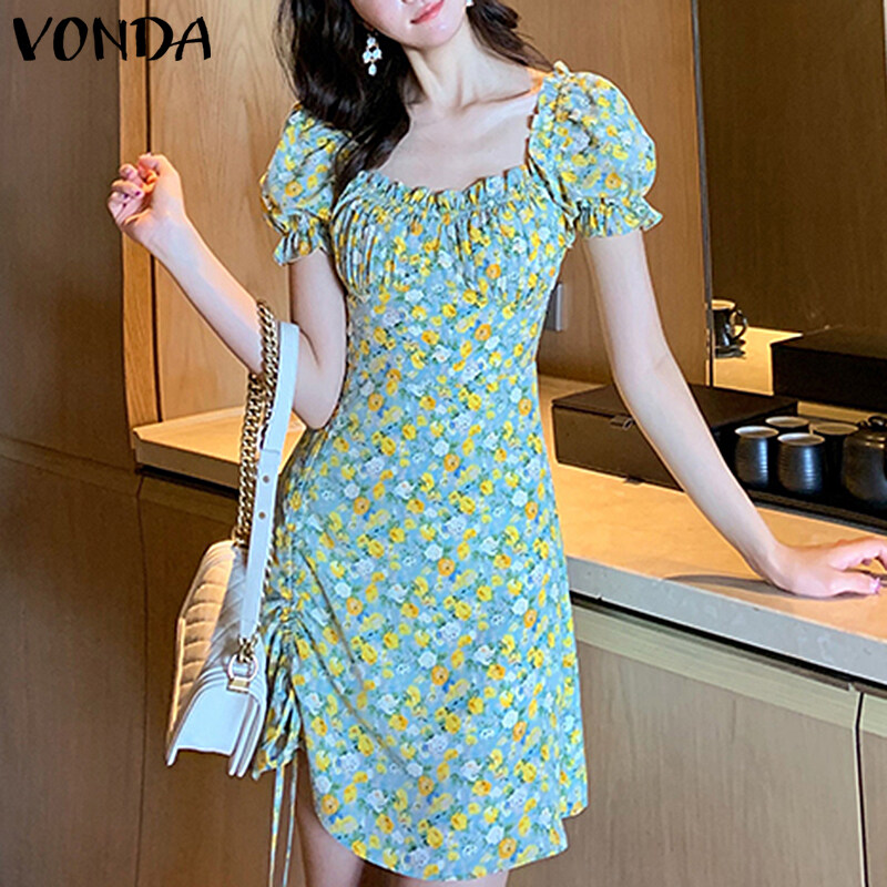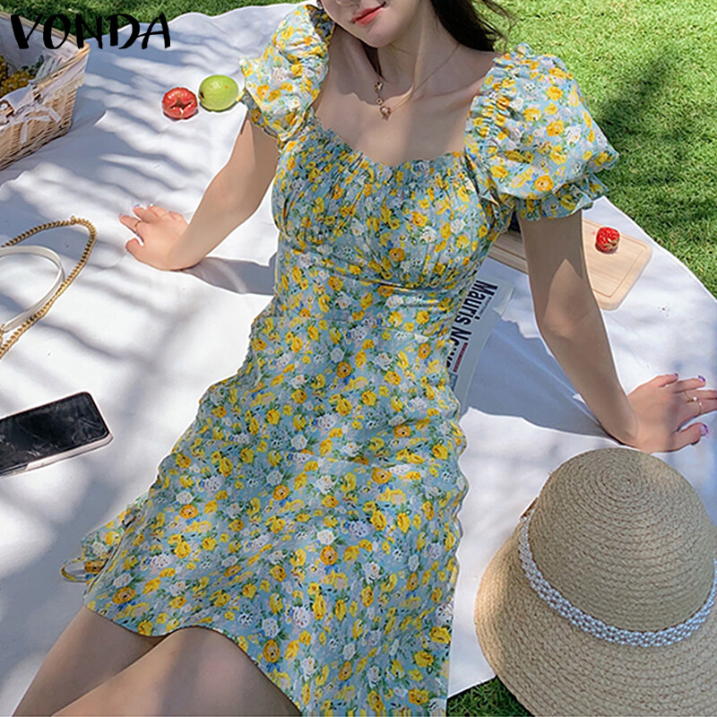 VONDA Womens Summer Puff Sleeve Mini Dress Printed Floral A-Line Dress Sundress (Korean Style)