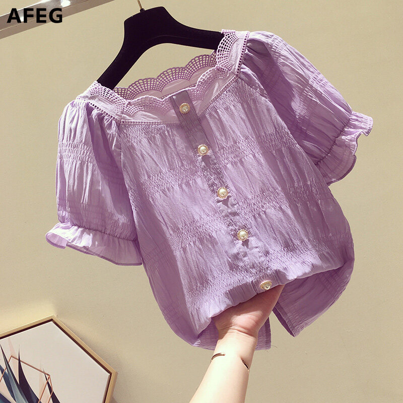 AFEG new Korean women's short-sleeved pure color elegant temperament blouse for women