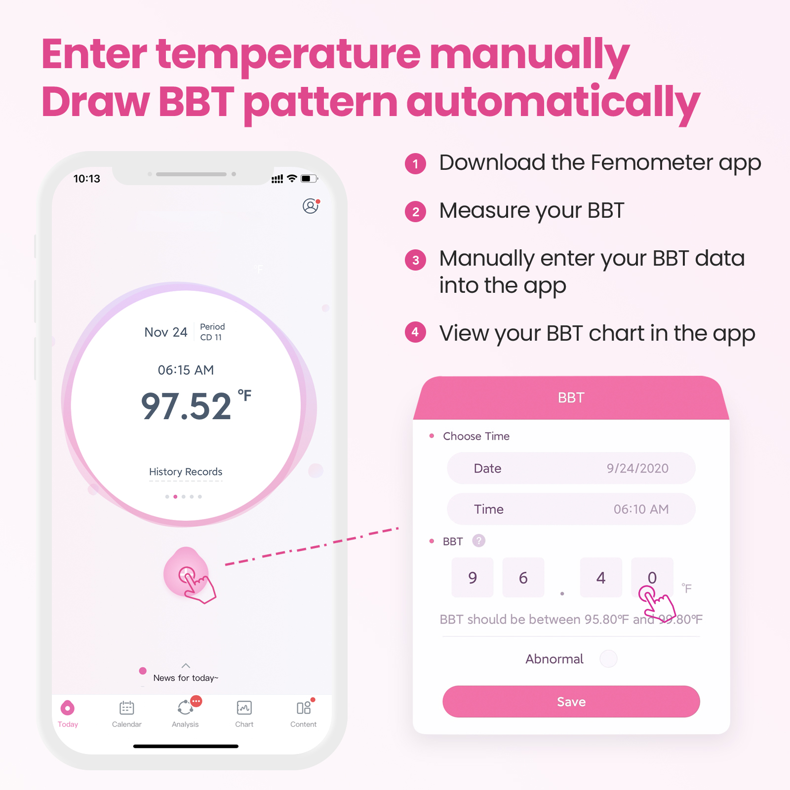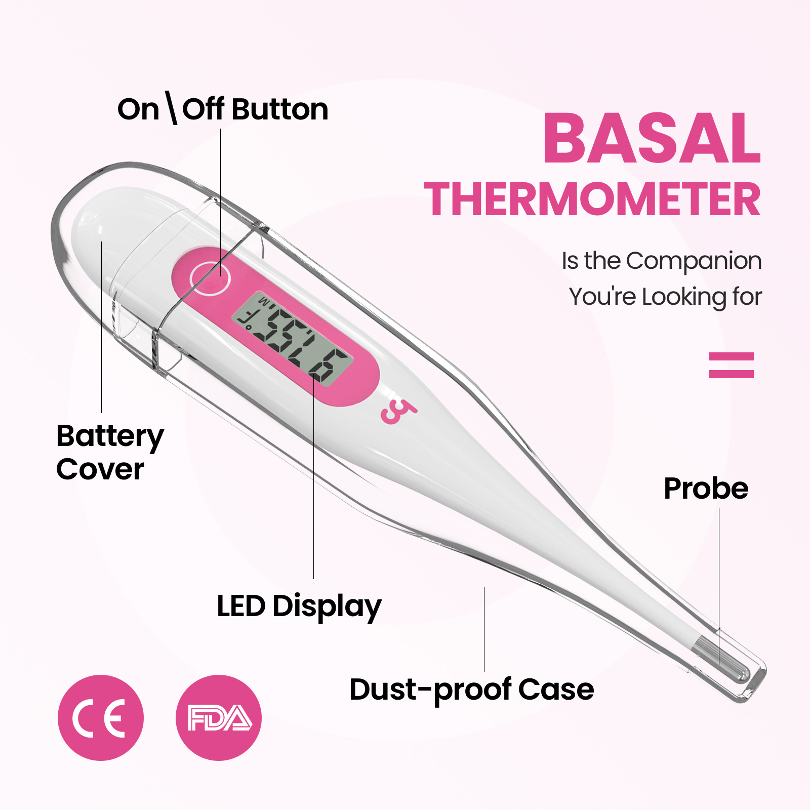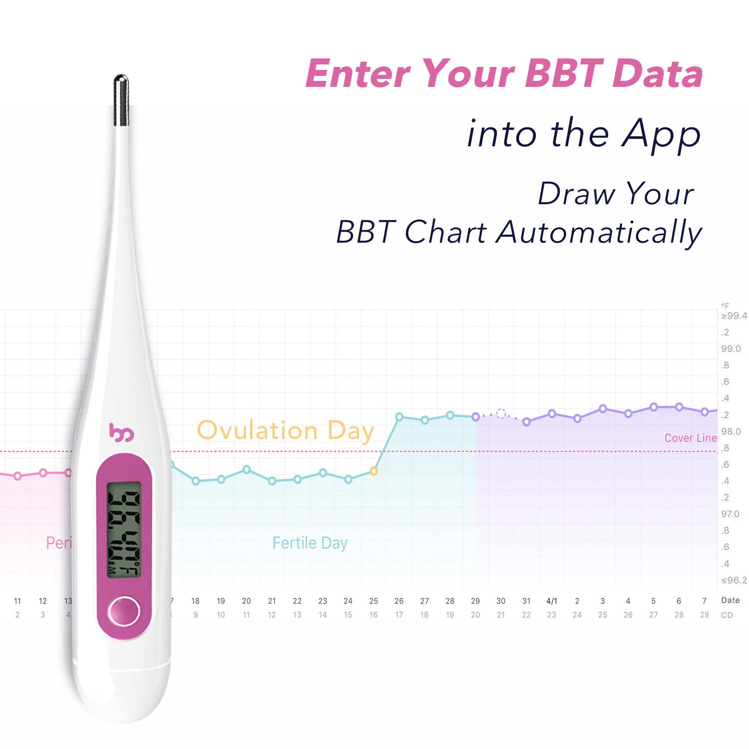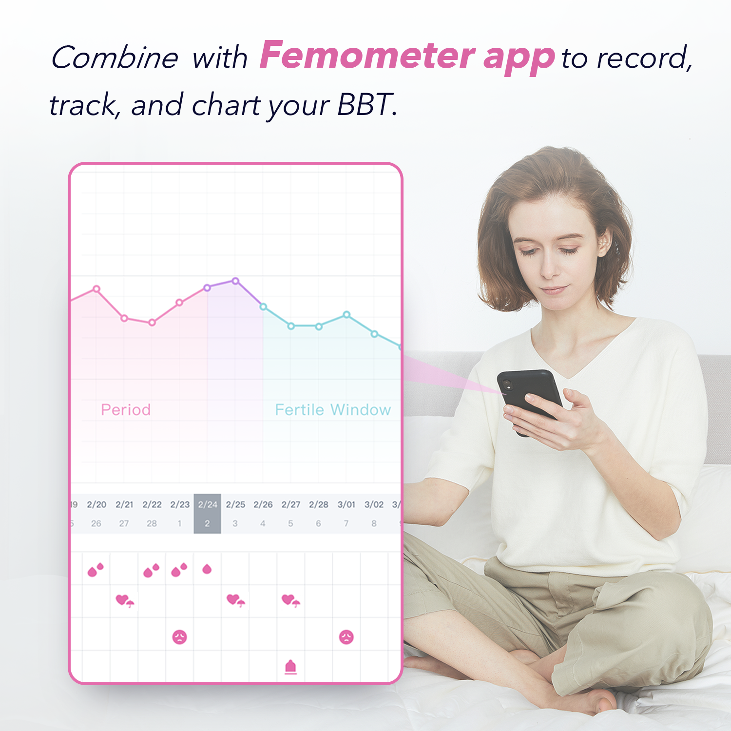Femometer Digital Basal Thermometer with LCD Screen. This thermometer helps you test your basal body temperature in the early morning. Combine with Femometer app to record, track, and chart your BBT. And it intelligently analyzes your BBT and calculates pregnancy rate of every day, thus helps with pregnancy, early-stage pregnancy monitor and manage your menstrual cycle better.