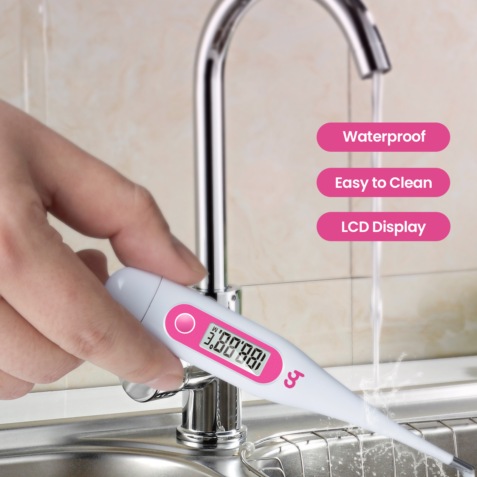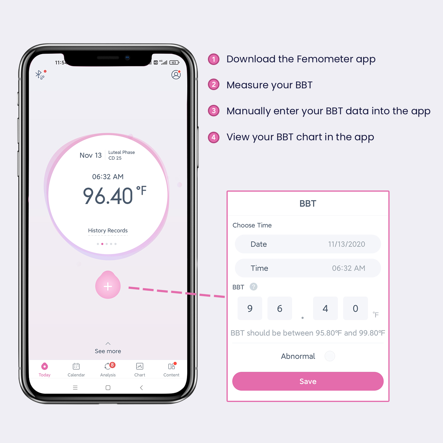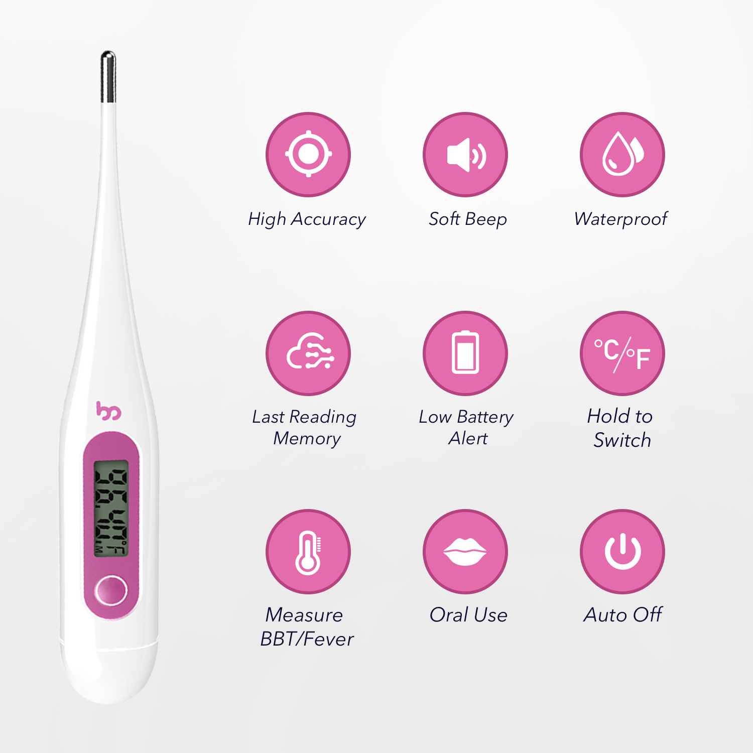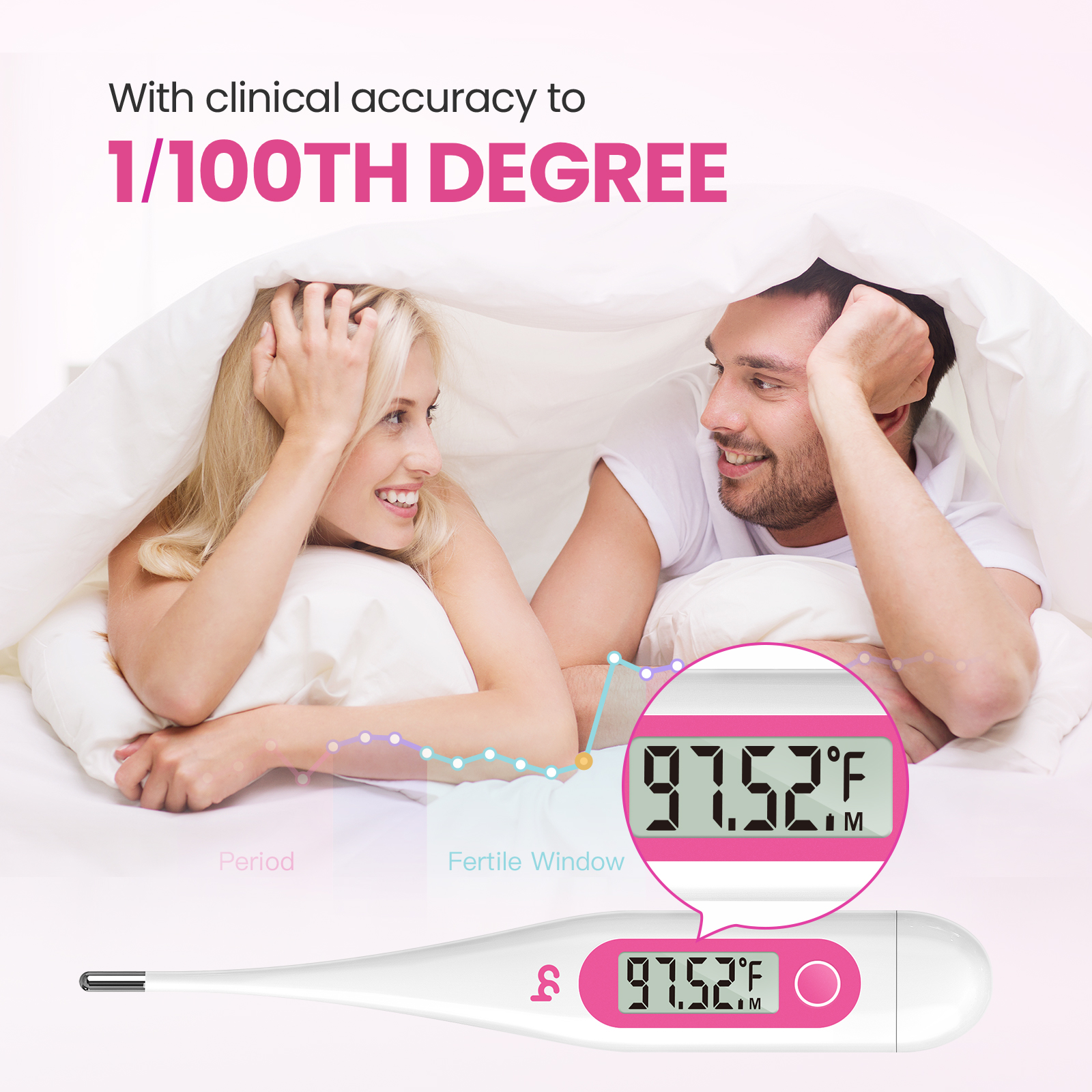 Femometer Digital Basal Thermometer with LCD Screen. This thermometer helps you test your basal body temperature in the early morning. Combine with Femometer app to record, track, and chart your BBT. And it intelligently analyzes your BBT and calculates pregnancy rate of every day, thus helps with pregnancy, early-stage pregnancy monitor and manage your menstrual cycle better.