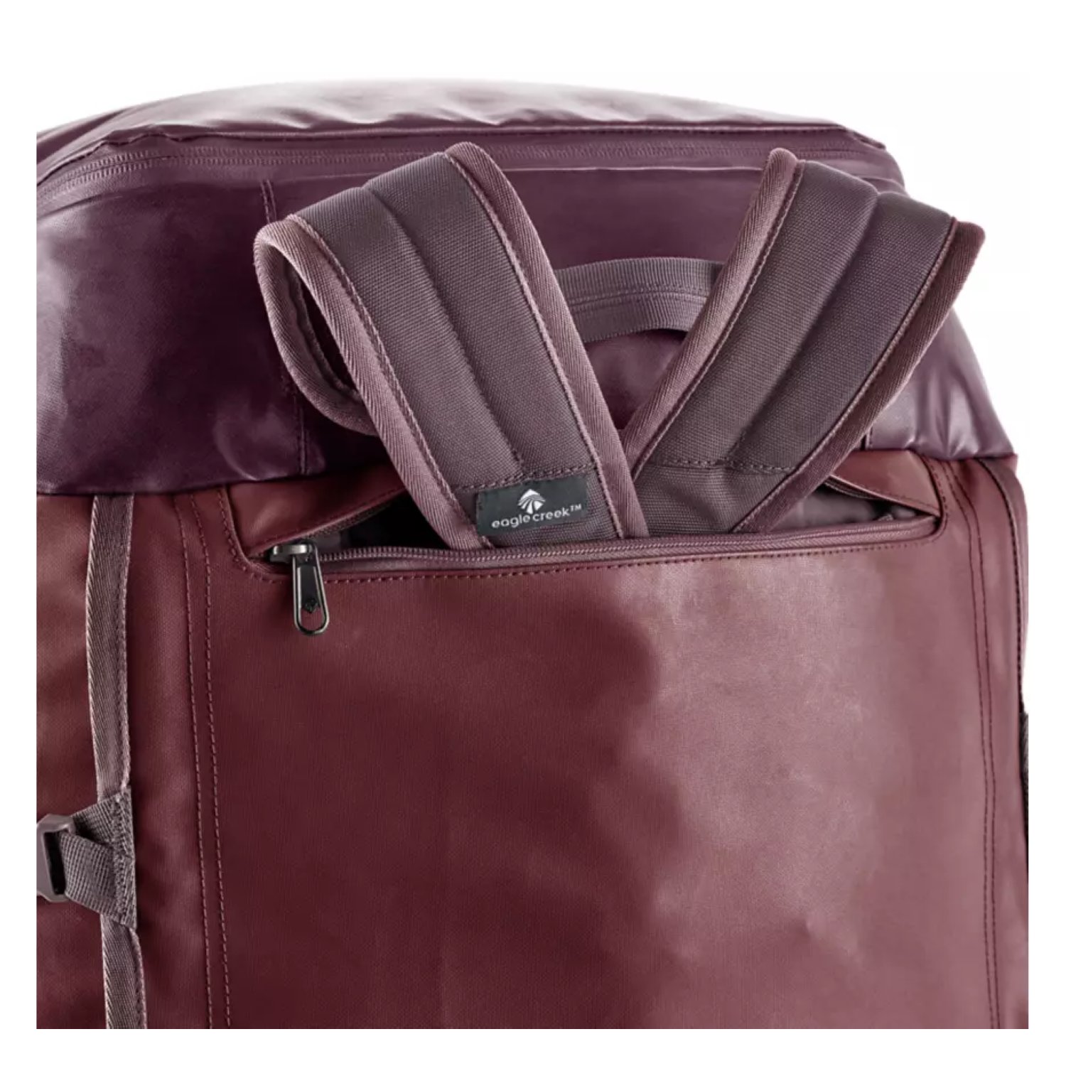 Zip-away backpack straps stow in front zip pocket, providing protection during baggage check in