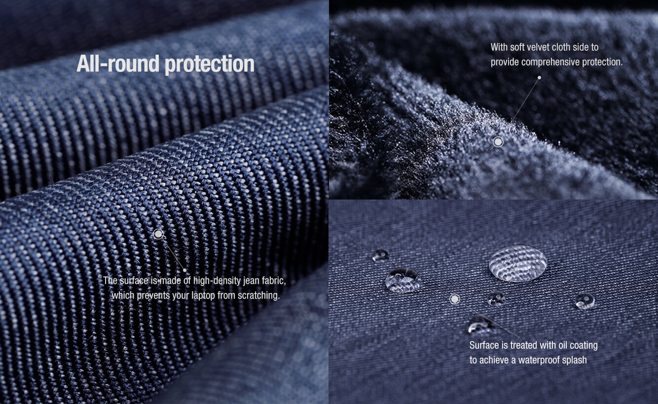 • The surface is made of high-density jean fabric, which is of good scratch resistant and waterproof splash. And the inside is equipped with a soft velvet cloth to protect your laptop from scratching.