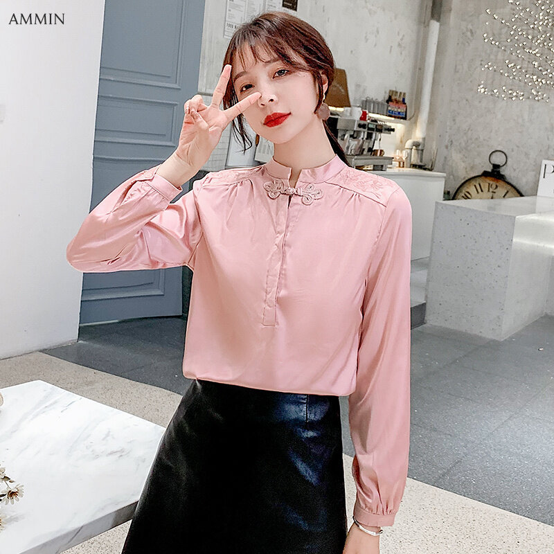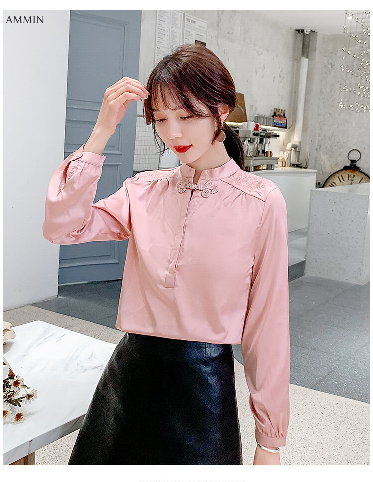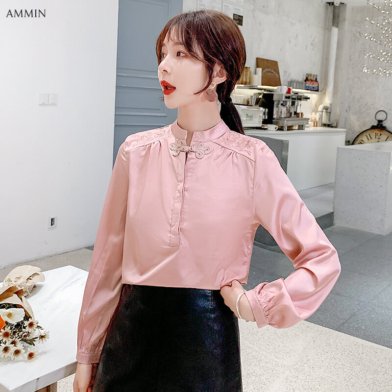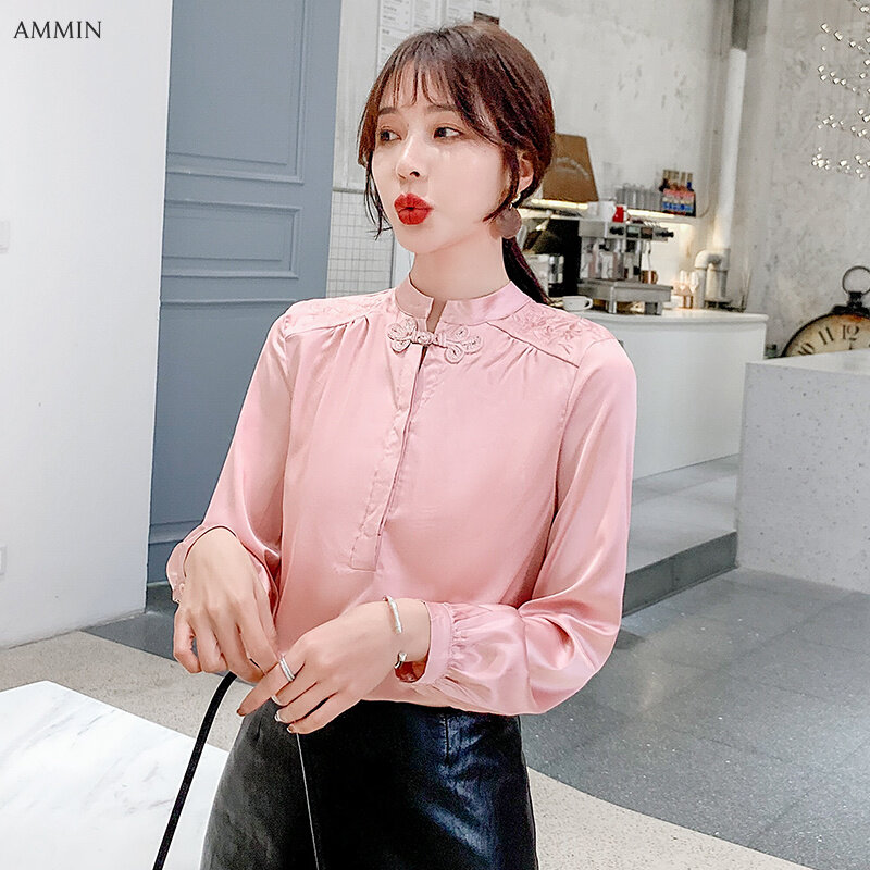 AMMIN Spring large size palace style embroidered western style blouse women Chinese style disc buckle retro gentle style large size long-sleeved silk shirt top 2021
