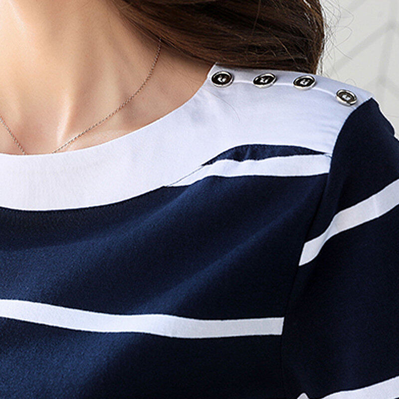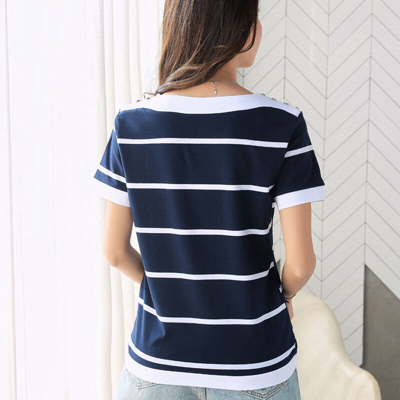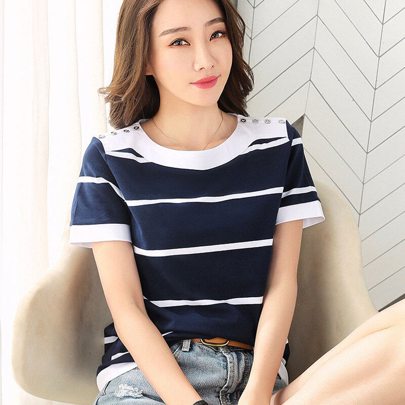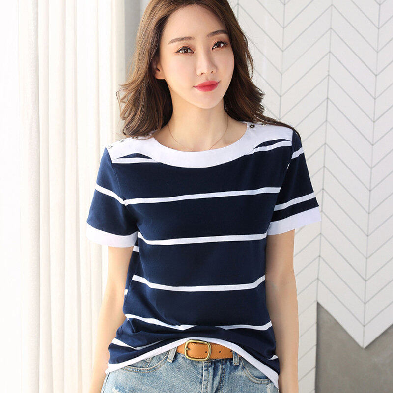 INWPLLR Fashion T-shirt Women Tops Summer White And Blue Striped T-Shirts New Korean Short Sleeve O-neck Ladies Tshirt Large Size