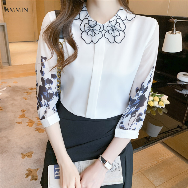 AMMIN OL elegant temperament short-sleeved white chiffon shirt women 2021 summer new style three-quarter sleeves unique design sense ink printing blouse top