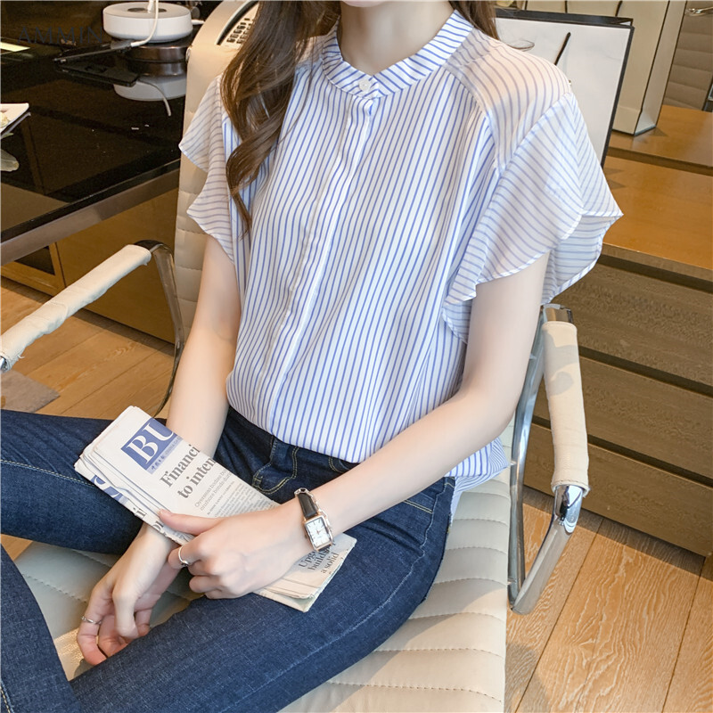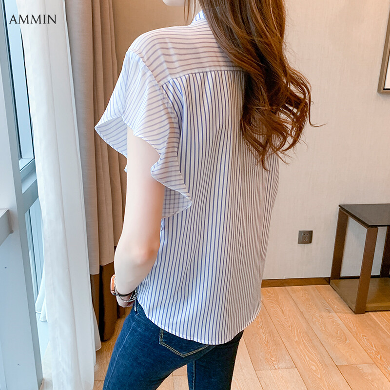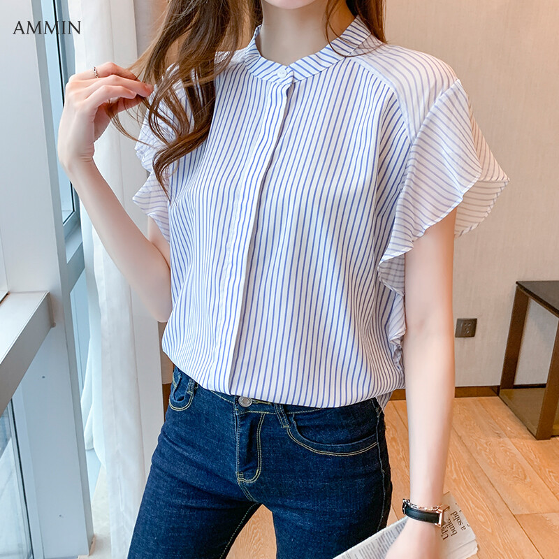 AMMIN 2021 new style short-sleeved personality design striped blouse summer stand-up collar lotus leaf sleeve elegant button cardigan chiffon commuter shirt tops 2021