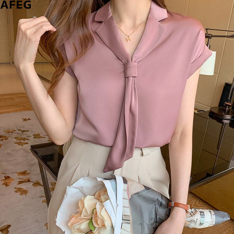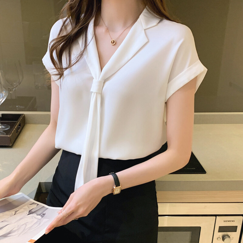 AFEG new Korean version of V-neck streamer fashion loose all-match chiffon short-sleeved blouse for women