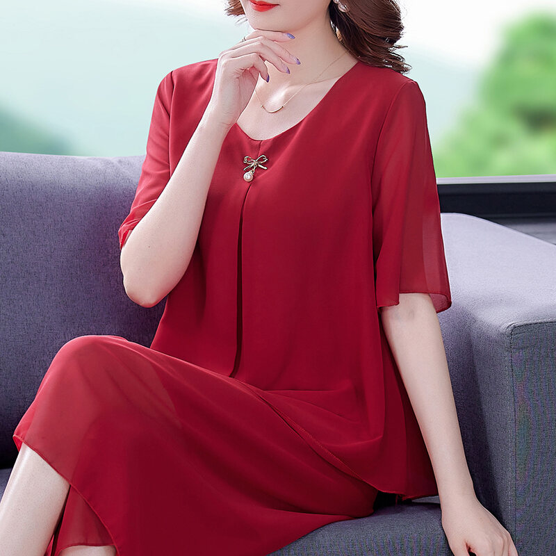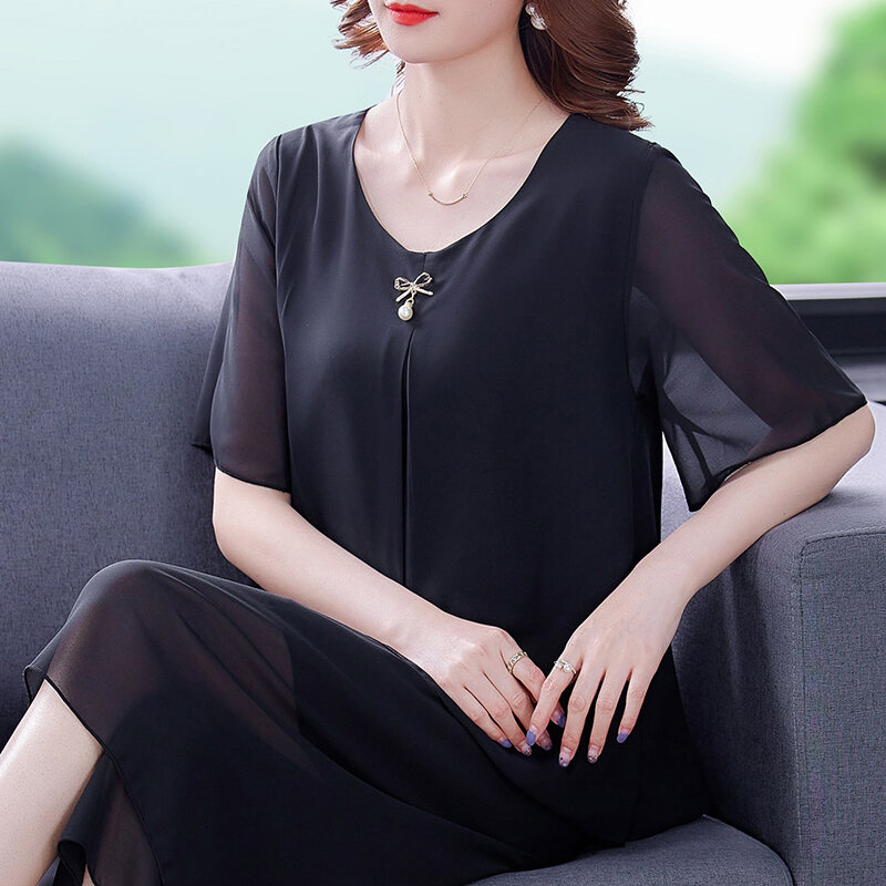 Large size dress women's summer Korean fake two-piece dress age-reducing short sleeve round neck A-line skirt slim mid-length skirt