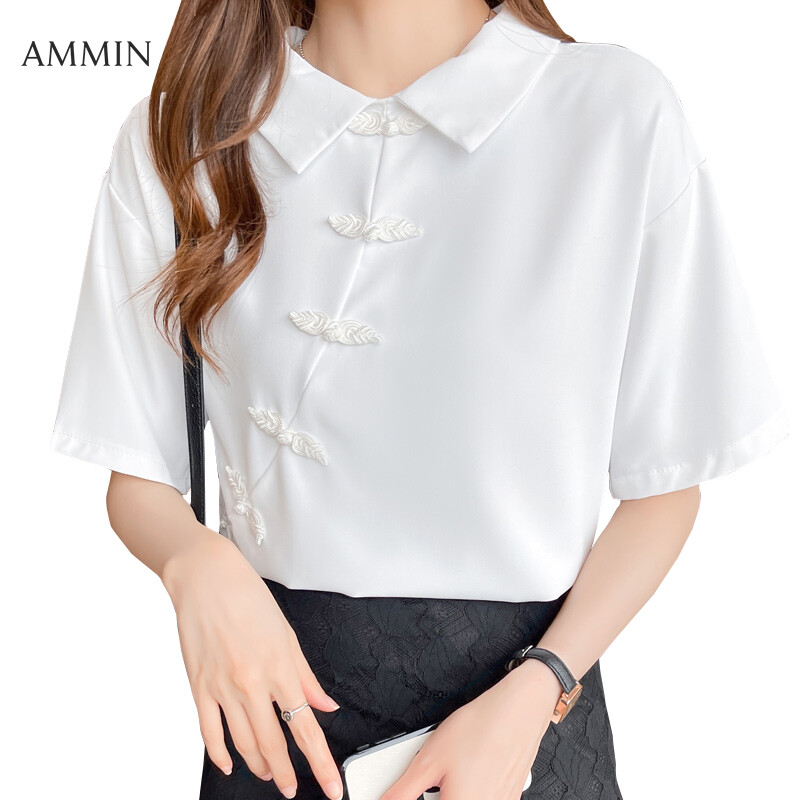 AMMIN 2021 summer new national style cheongsam disc button short-sleeved shirt women's simple fashion loose polo lapel elegant sweet blouse tops inside hot