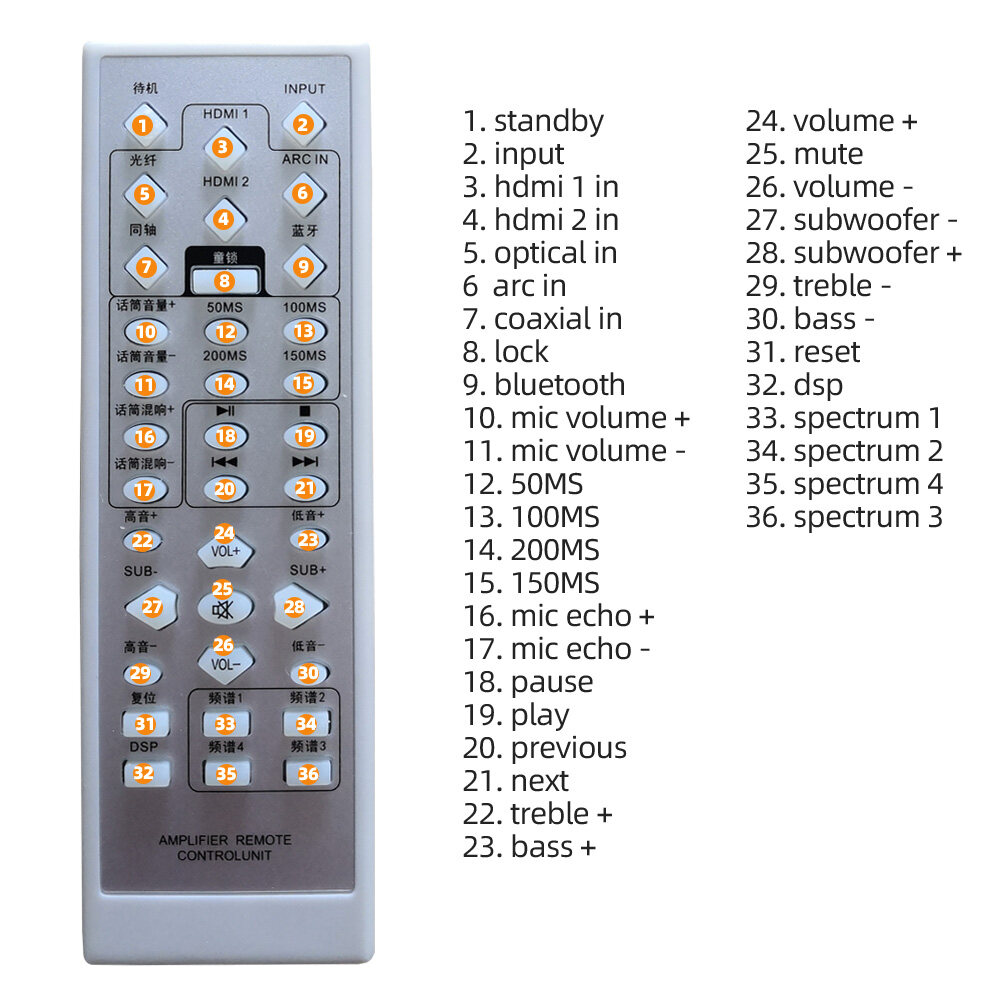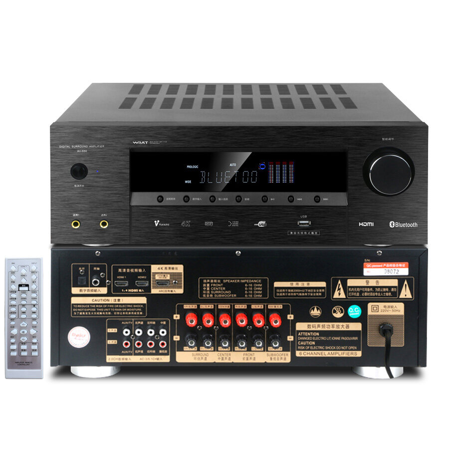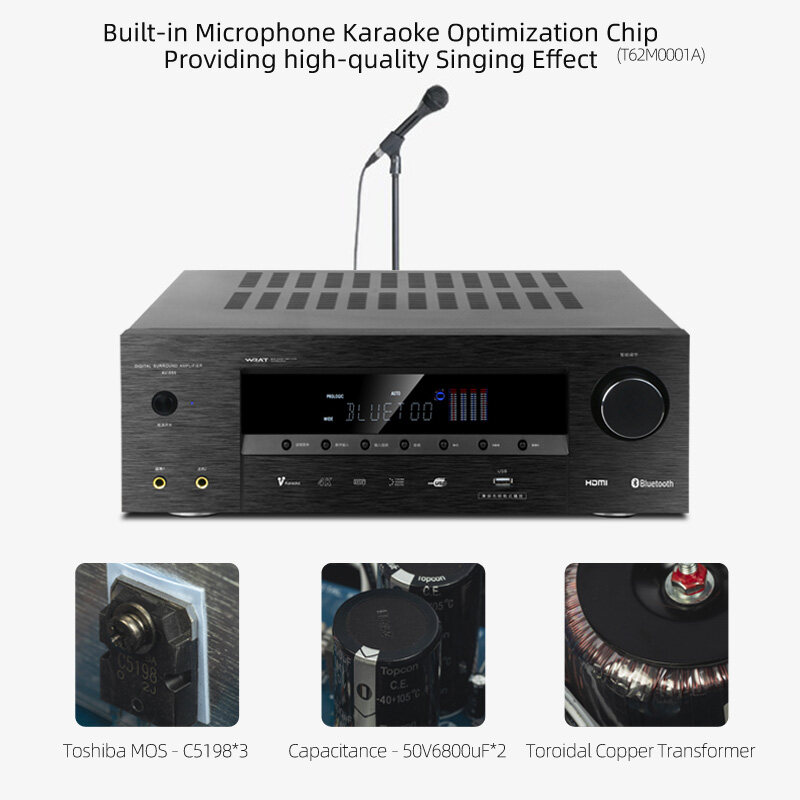 Amplifier can only be used with 220V~240V 50Hz/60Hz AC power supply. Support 4-8 ohm speakers.Built-in professional kalaok chip. Improve the microphone input sound effect.Front right channel: 50W / Front left channel: 50W.Surround right channel: 30W / Surround left channel: 30W.Center channel: 50W / Bass channel: 50W.In addition to Bluetooth, you can use a variety of ways to connect your player (including televisions, mobile phones, computers, projectors, etc.).1. You can use the hdmi/coaxial/optic audio cable to connect TV.2. You can use a 2 to 2 audio cable to connect your TV's RCA audio output jack.3. You can use 1 to 2 audio cable to connect your TV headset jack.This amplifier supports lossless music playback, you can play multiple formats of music via USB input (including APE/FLAC/MP3/WMA).
