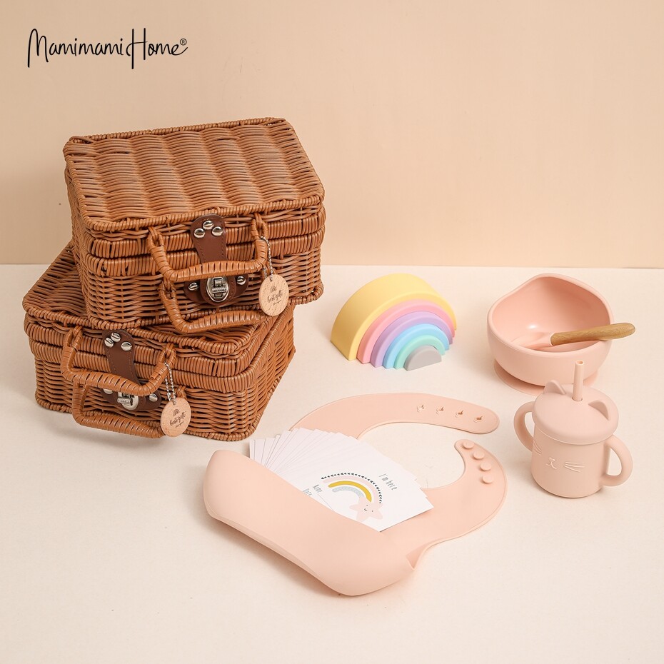 2.Peach Set: 1 x Silicone Bib,1 x Silicone Spoon,1 x Sippy Cup,1 x Silicone Bowl,1 x Silicone Building Block,1 x Rattan Box,16 x Milestone Cards