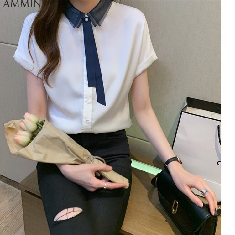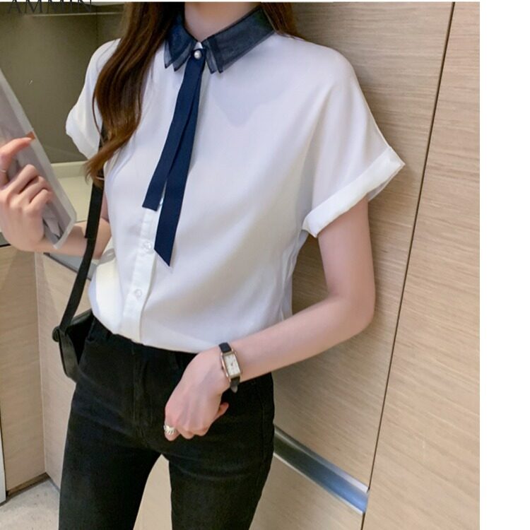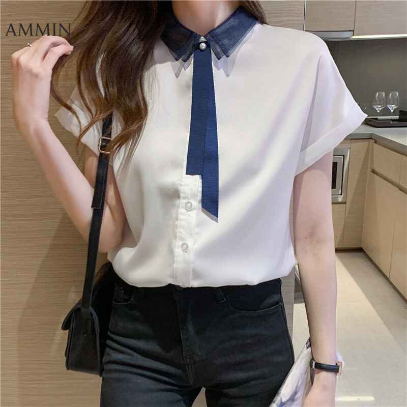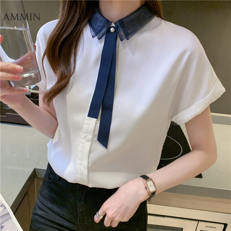 AMMIN Tops 2021 summer new style mesh stitching lapel satin ribbon short-sleeved silk shirt women's personality design sense of contrast stitching loose single-breasted cardigan blouse