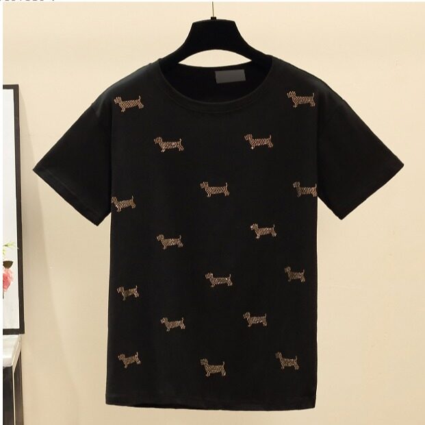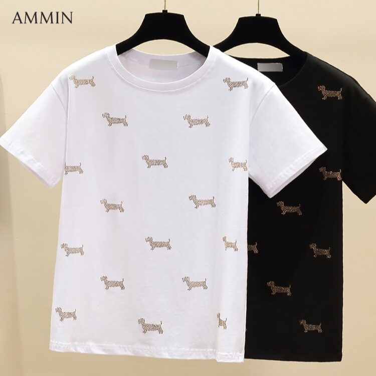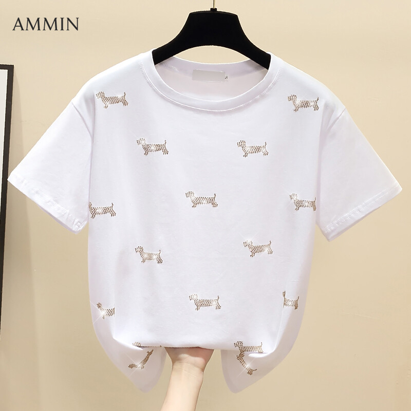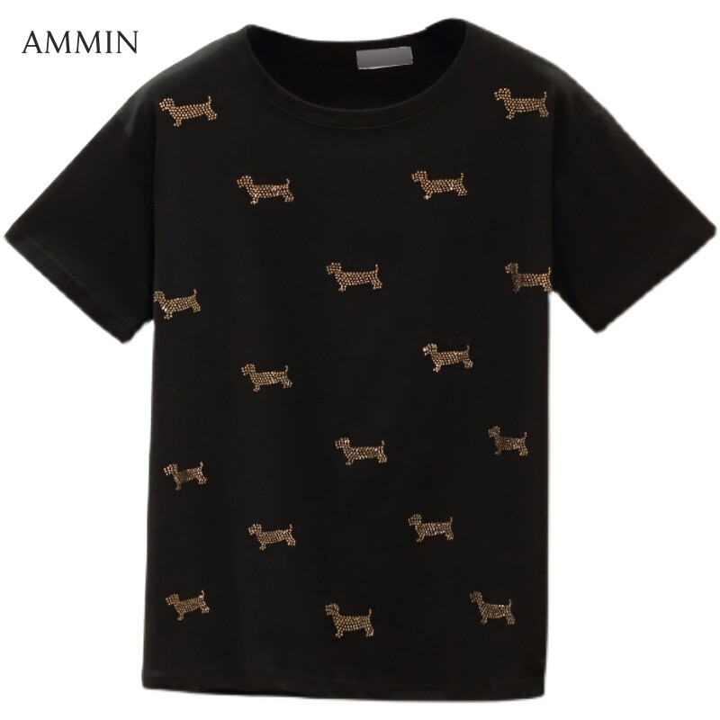 AMMIN Tops 2021 new summer Korean round neck short-sleeved animal pattern cotton T-shirt with rhinestones for women's simple and fashionable doggie three-dimensional printing rhinestone all-match blou