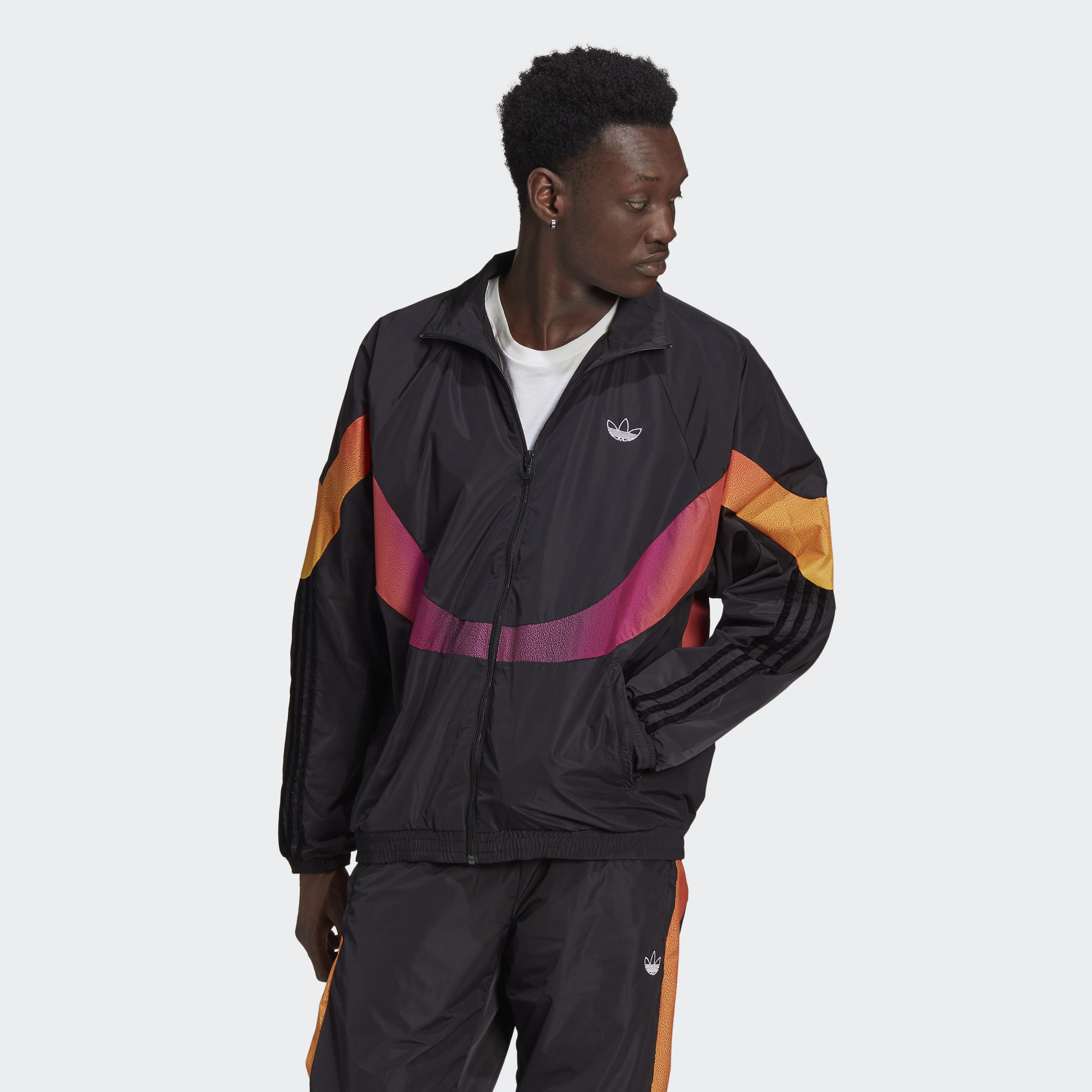 Come out on top with the winning combo of sport and total swagger. The ribbon of colours that flows around this adidas track jacket can't be missed. One, because it's bright. Two, because it's pure, undeniable steez. The loose shape layers casually. Just how you'll be chillin'. This product is made with recycled content as part of our ambition to end plastic waste.