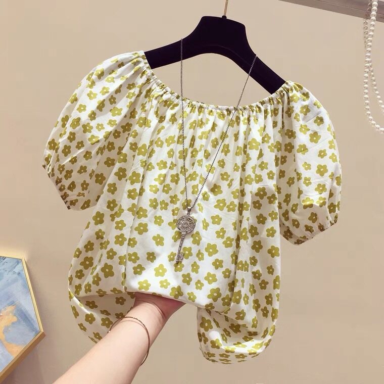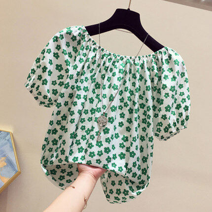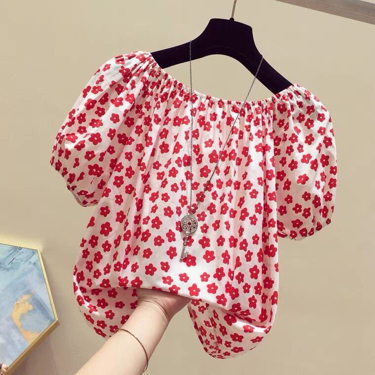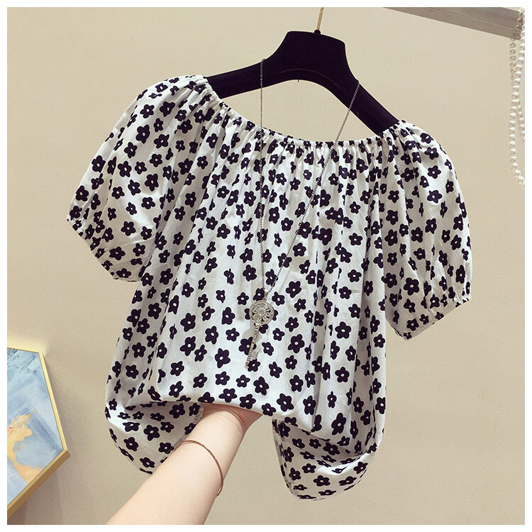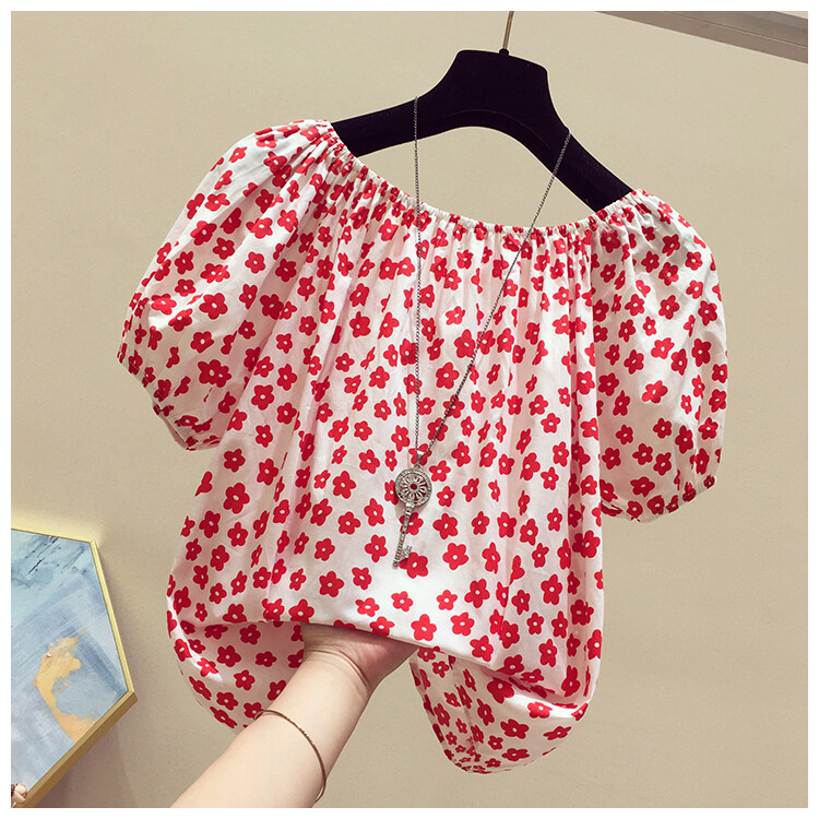 AMMIN Tops 2021 new style floral print short-sleeved elegant chiffon shirt women's summer elastic boat neck strapless short style simple fashion all-match blouse