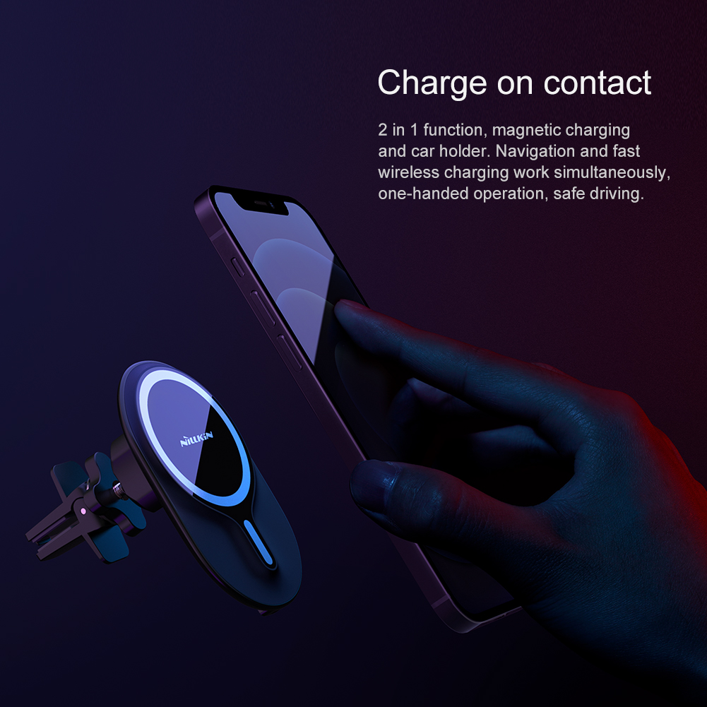 Fast Wireless Charging, Safe DrivingFor iPhone 12 & 13 Series*Note: It's suggested to use with iPhone 12 or 13 series only or with magnetic case.Do note that it can work with Android phone that support wireless charging. Just need to get a magnetic ring sticker to allow it to stick to the holder.Charge on contact - 2 in 1 function, magnetic charging and car holder. Navigation and fast wireless charging work simultaneously, one hand operation, safe driving.Strong Magnet - Ring magnets are reasonably distributed to form a closed magnetic field, gives a 900g of suction. It's very stable even in bumpy road conditions. 900g of suction is equivalent to the weight of 4 iPhone 12 Pro Max.*The closed magnetic field doesn't affect mobile signal.Intelligent Fast Wireless Charging - Intelligently adapt 7.5W fast wireless charging for iPhone 12 & 13 Series.360 degree rotation - with a 360 swivel ball, you can easily adjust different viewing angles.Stable and safe charging - The heat dissipation holes are on the back to help speed up internal air flow to keep constant temperature.Upgraded knob-type fixing clip - According to different thickness of air outlets in cars, you can adjust the clip position.Compact design - Use more integrated components to make product slim. Add soft silicone on the contact surface of the clip to protect the fan from damage.Multiple Protection - Overvoltage protection , overcurrent protection, ESD protection, short circuit protection, FODWidely compatibility - The clip is suitable for the majority of air outlets of cars, easy to install.