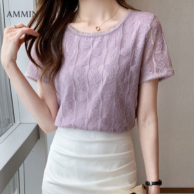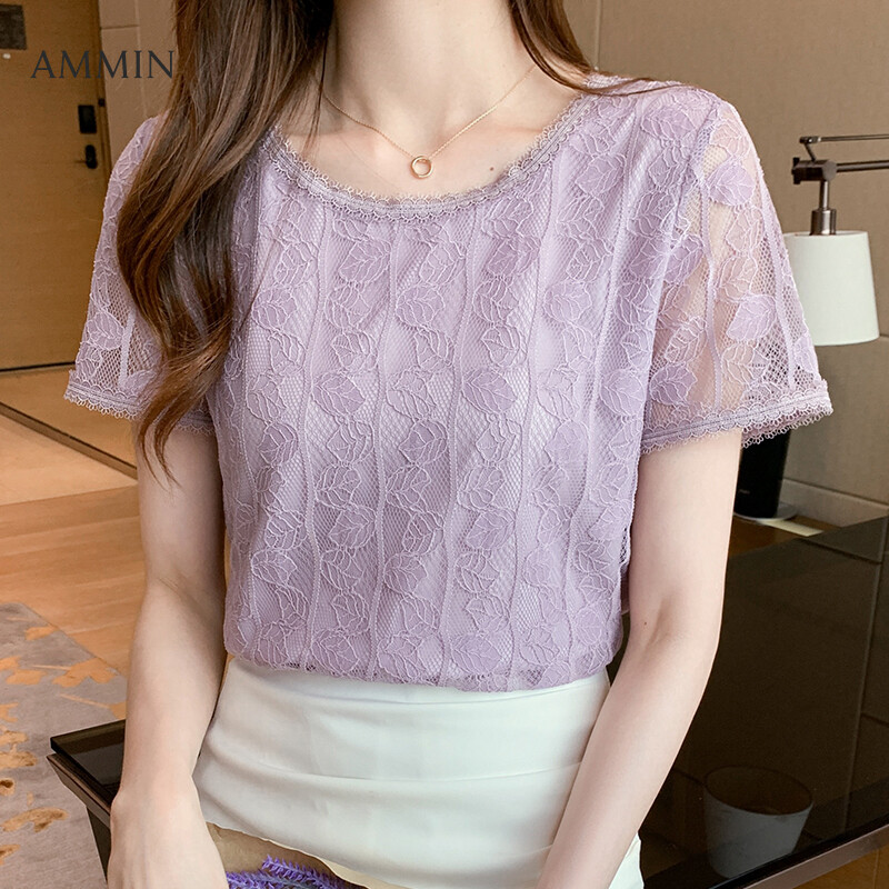 AMMIN Tops 2021 summer new elegant temperament Korean crocheted hollow lace shirt round neck short sleeve sweet fashion embroidery all-match blouse