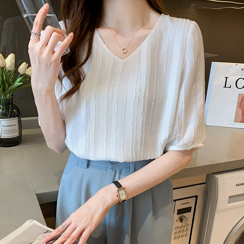 YIGE 2022 summer new jacquard V-neck blouse short-sleeved chiffon blouse fashion loose big size shirt