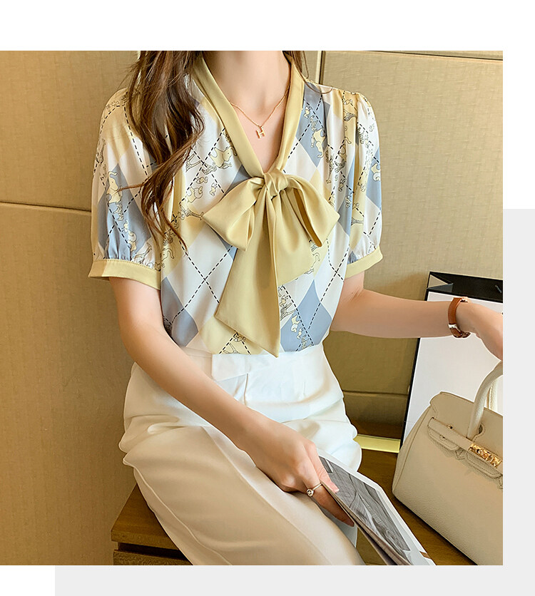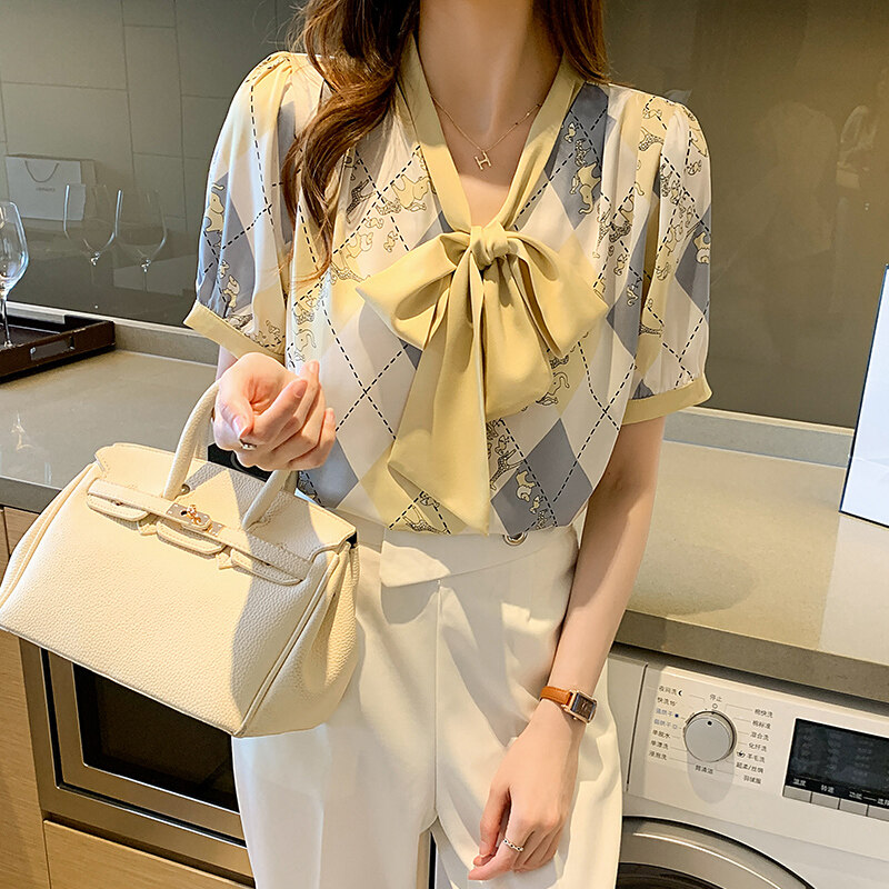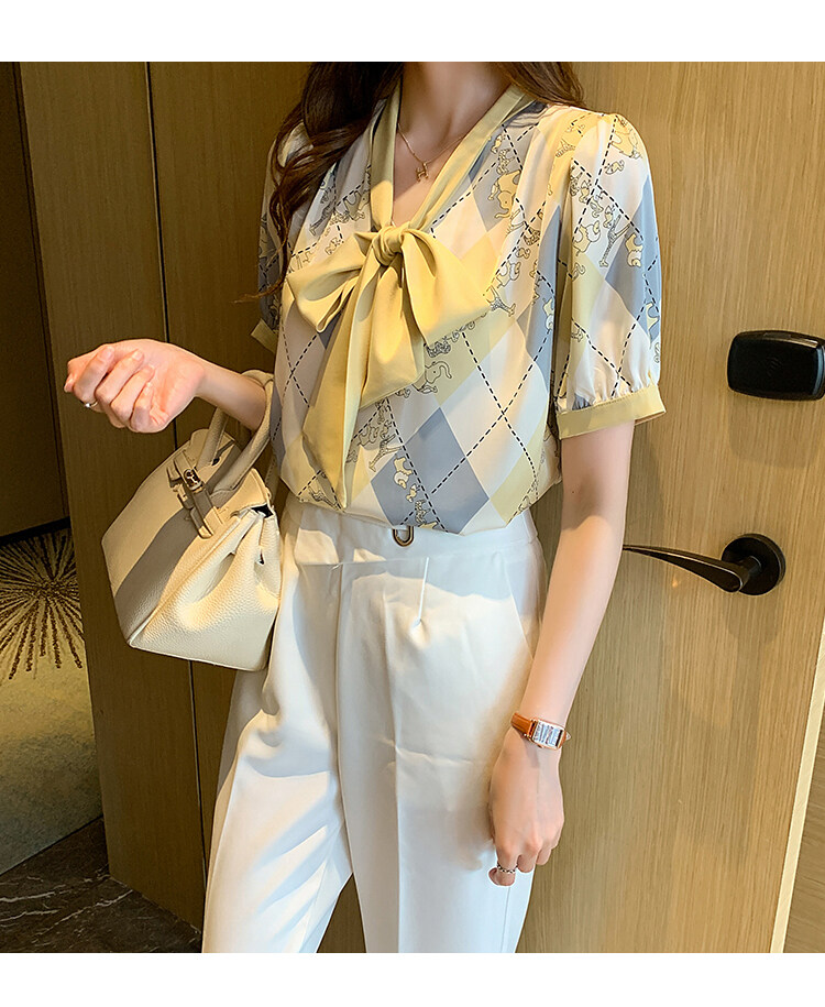 AFEG Korean style women's short-sleeved printed bow tie temperament blouse for women