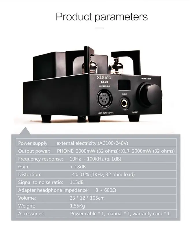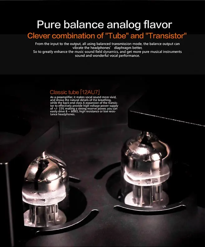 >Pure balance analog flavor. Clever combination of Tube and Transistor. From the input to the output, all using balanced transmission mode, the balance output can vibrate the headphones diaphragm better,So to greatly enhance the music sound field dynamics, and get more pure musical instruments sound and wonderful vocal performance