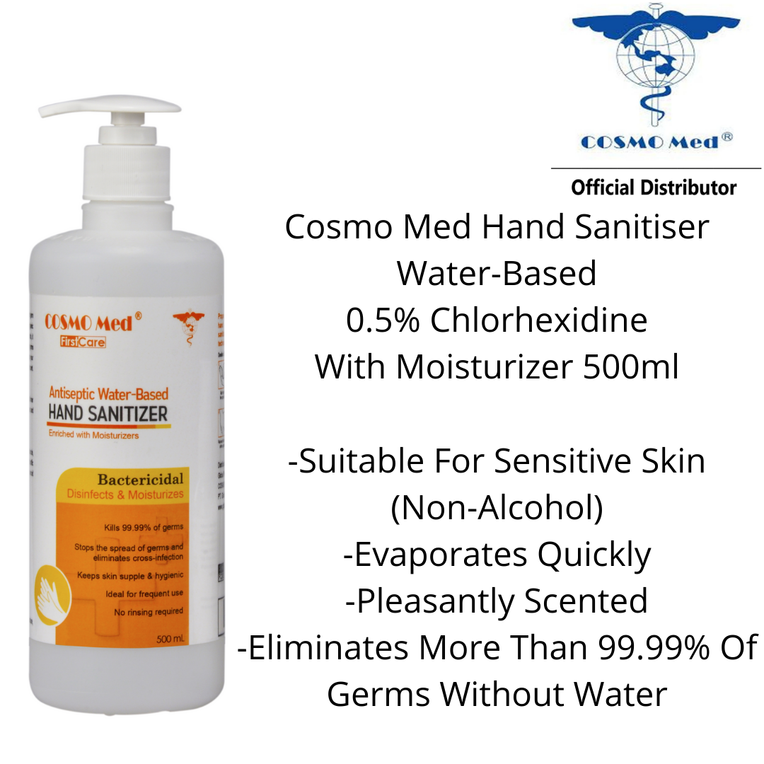Cosmo Med Hand Sanitizer Water-based 0.5% Chlorhexidine With Moisturizer 500ml (With Pump)- For Sensitive Skin