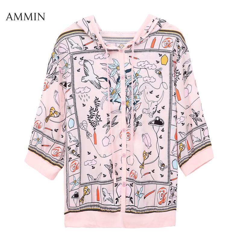 AMMIN Tops 2021 summer new high-end floral print hooded lace elegant T-shirt women's summer short-sleeved button cardigan sunscreen silk blouse