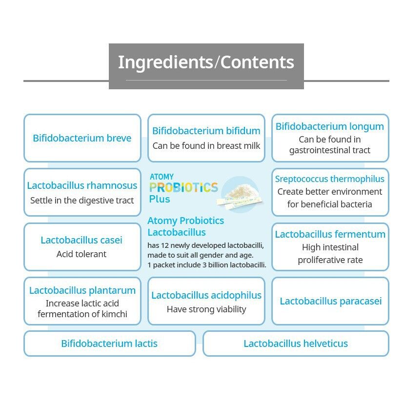 12 types of mixed Lactobailli make your stomach happy. Increases helpfful Lactobacilli, restrains growth of harmful bacteria and help with bowel movement.Recommend Users: ↪ People who want to maintain intestinal health↪ People who experience irritable bowel movements↪ Children and youth that need to strengthen the immune system↪ People with bad breath↪ People looking for tasty and easy to use Probiotics↪ People who want to maintain a healthy lifestyle↪ People with irregular bowel movements due to unhealthy eating↪ People with unhealthy bowels due to stress and bad eating habits↪ People who have trouble digesting dairy products↪ People who experience indigestion due to lack of physical activity↪ People with constipation due to irregular eating and living habits↪ People who sit for long periods