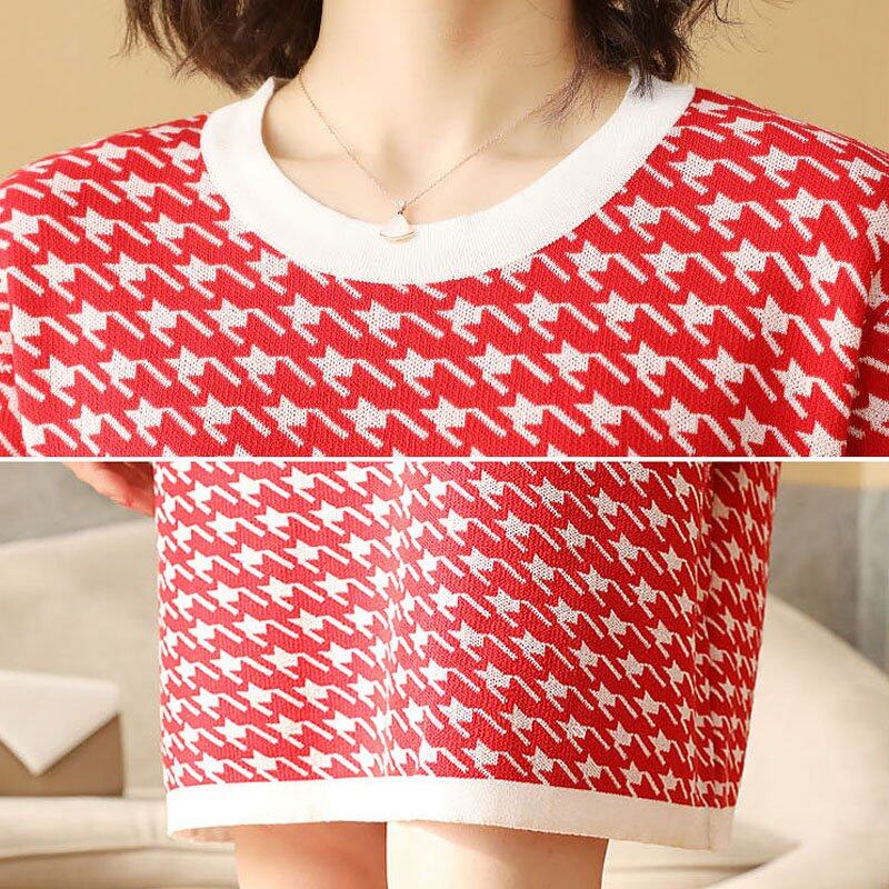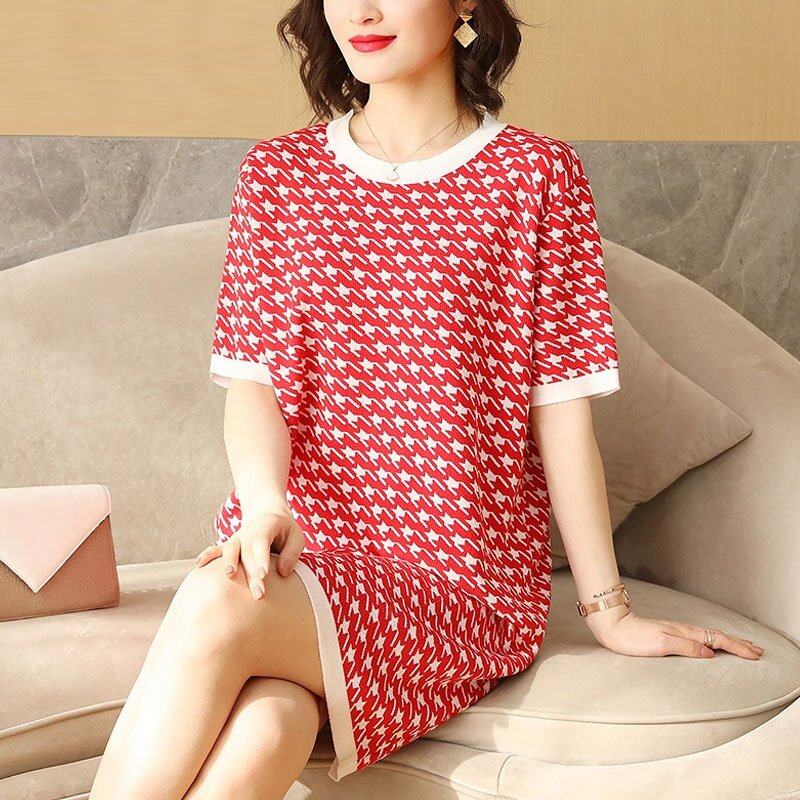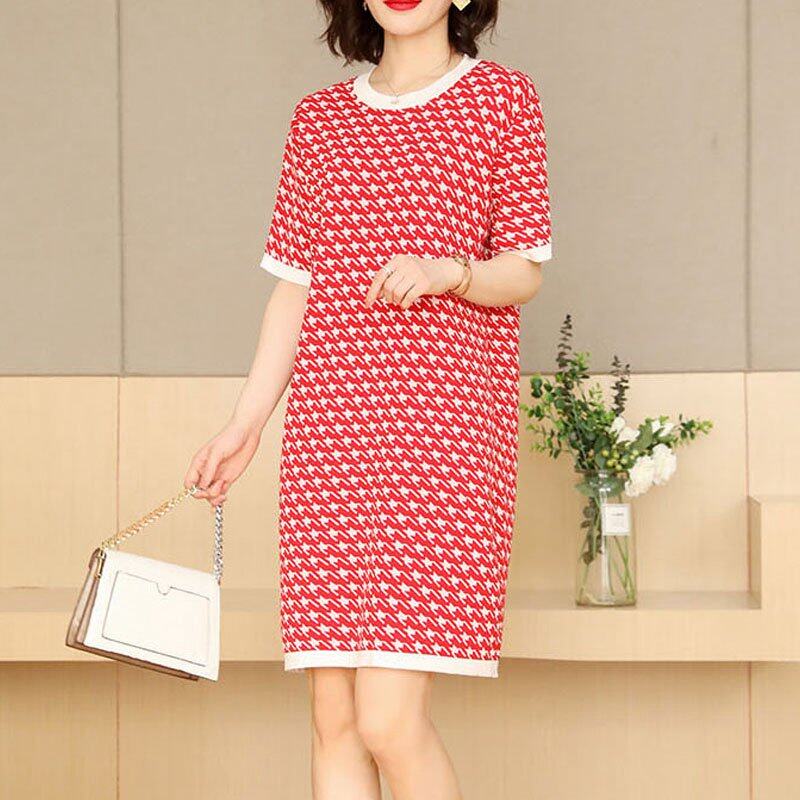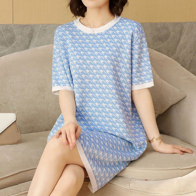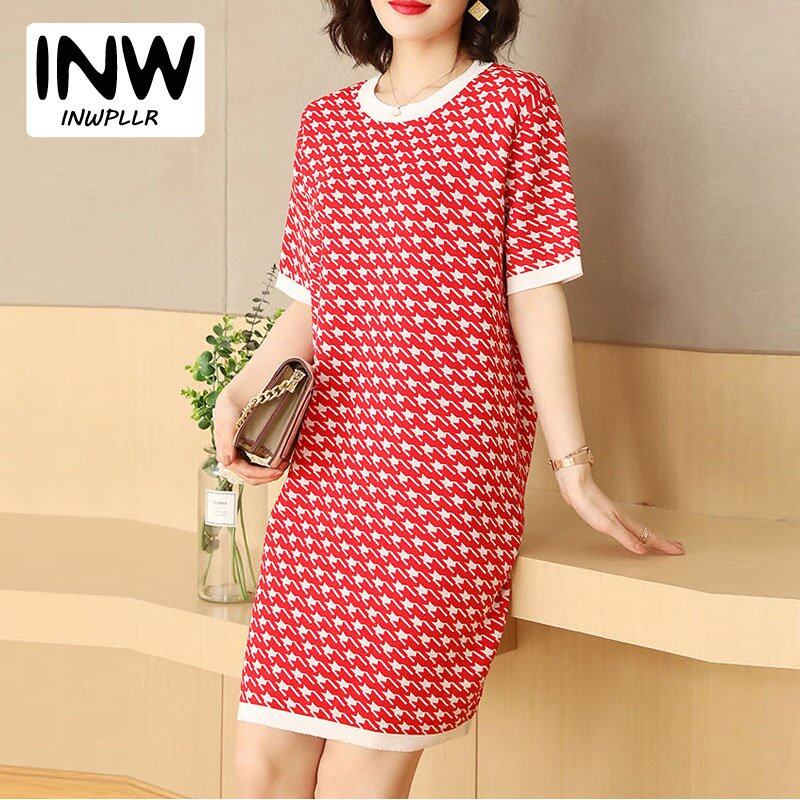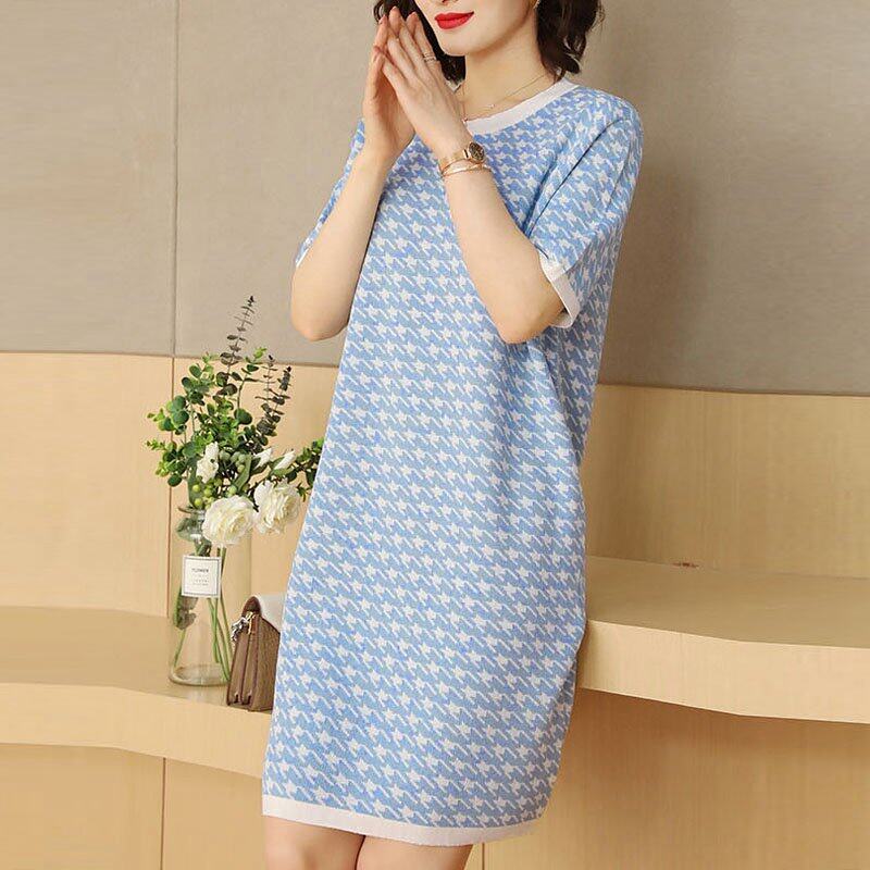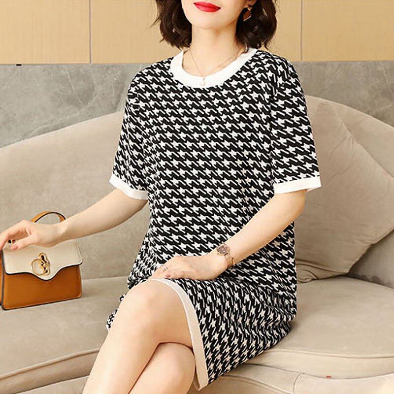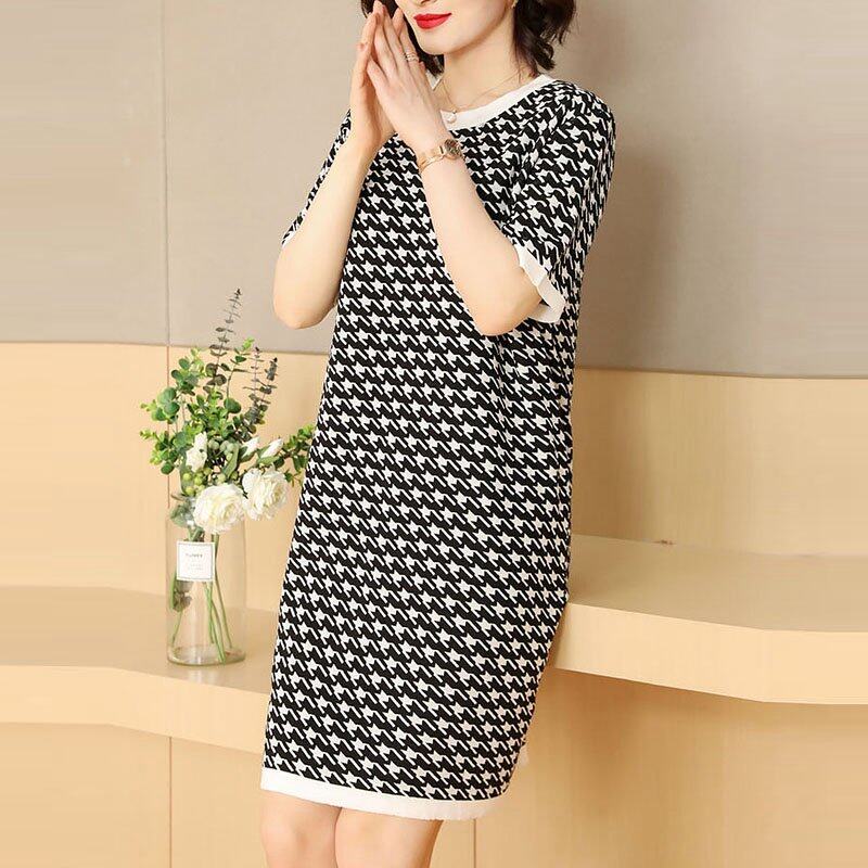 INWPLLR Women's Fashion Dresses Houndstooth Dress Casual Korean Short Sleeve Round Neck Ladies Dress All-match Fashionable Dress