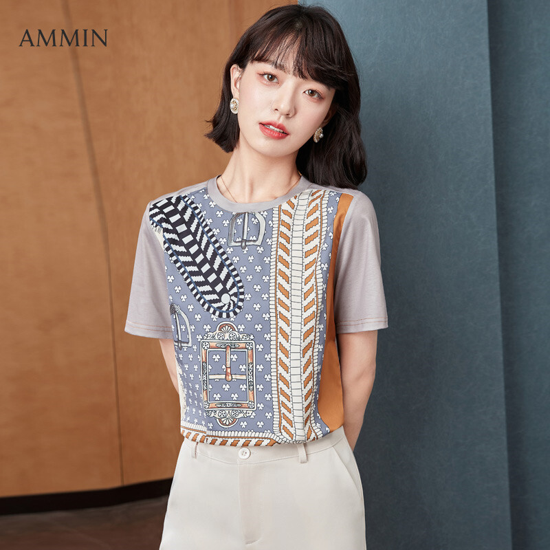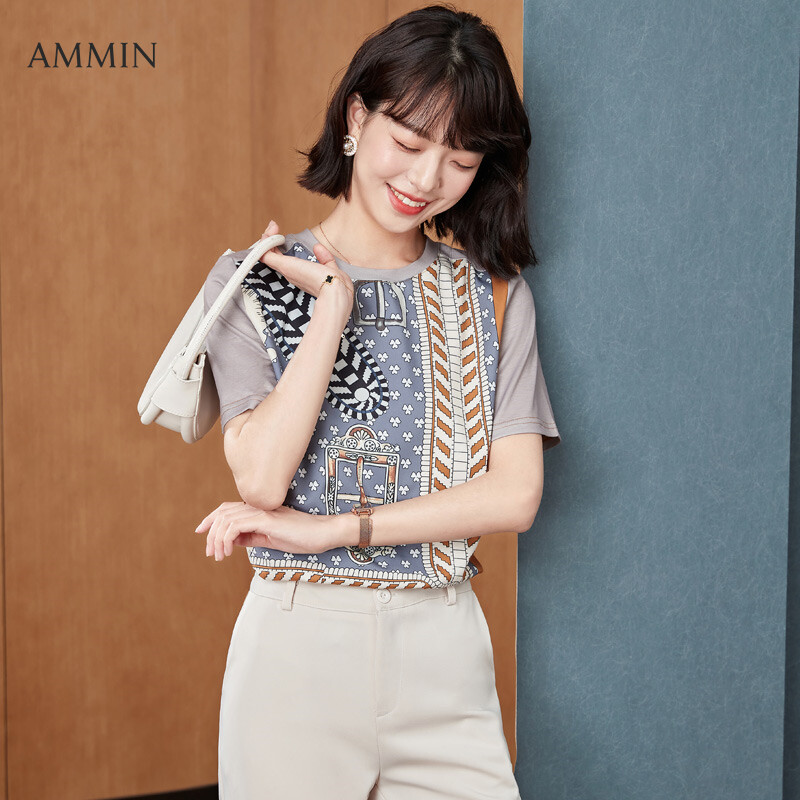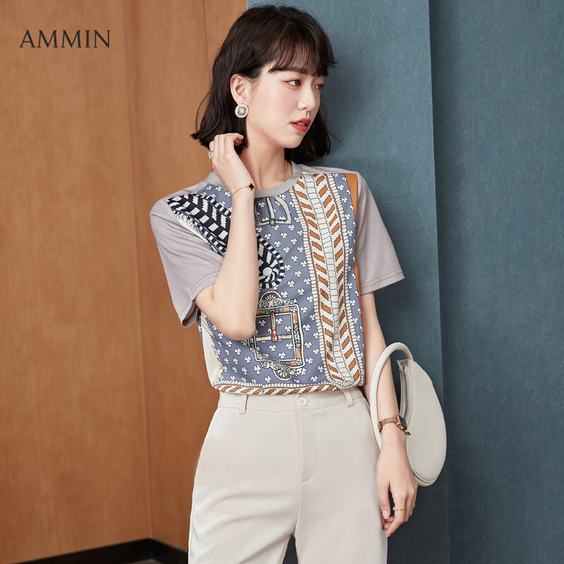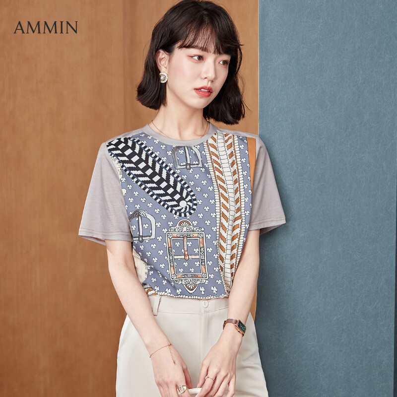 AMMIN 2021 summer new style retro western-style printed silk stitching round neck fashion all-match blouse women's Korean short-sleeved simple and elegant t-shirt ins hot tops